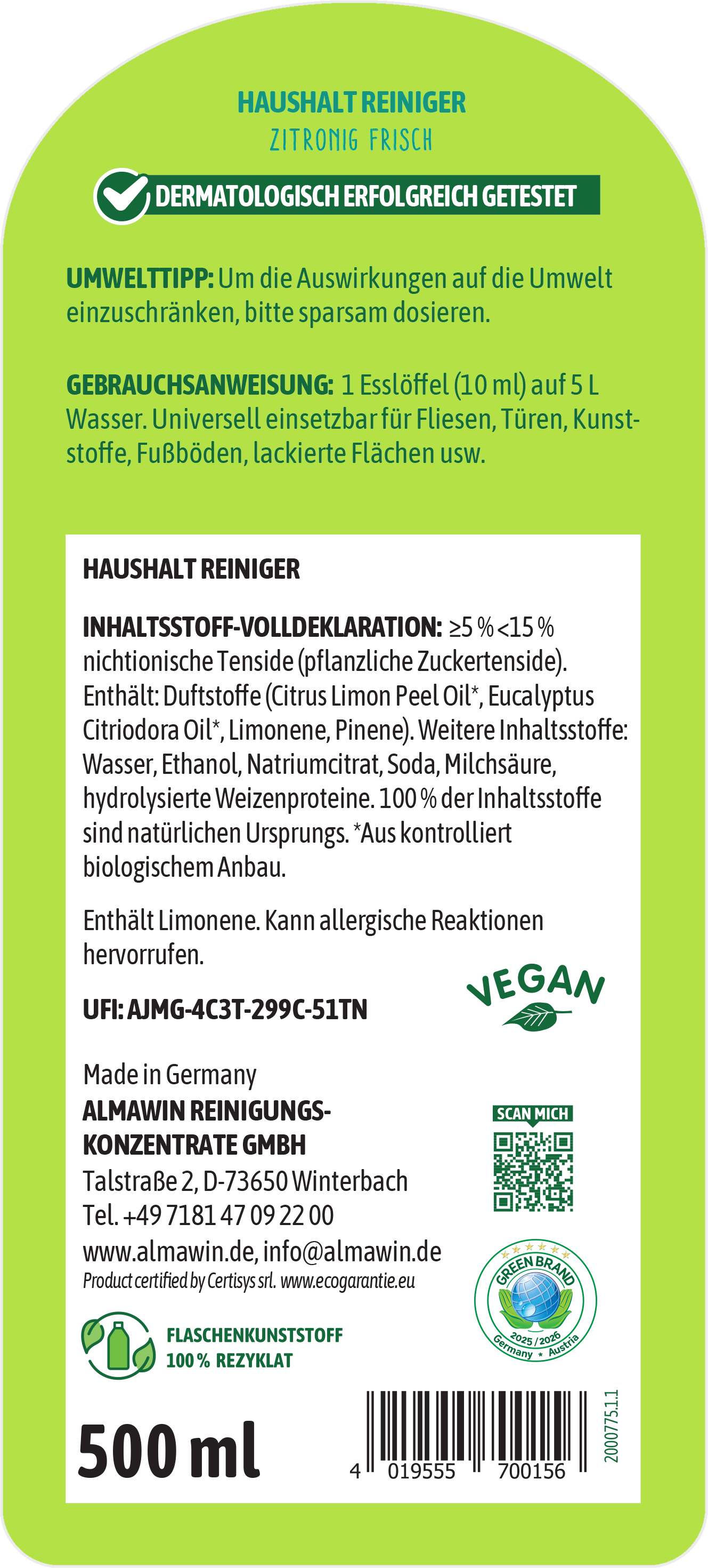 | Hersteller: | AlmaWin Reinigungskonzentrate GmbH, Talstraße 2, 73650, Winterbach, Deutschland, info@almawin.de, www.almawin.de |