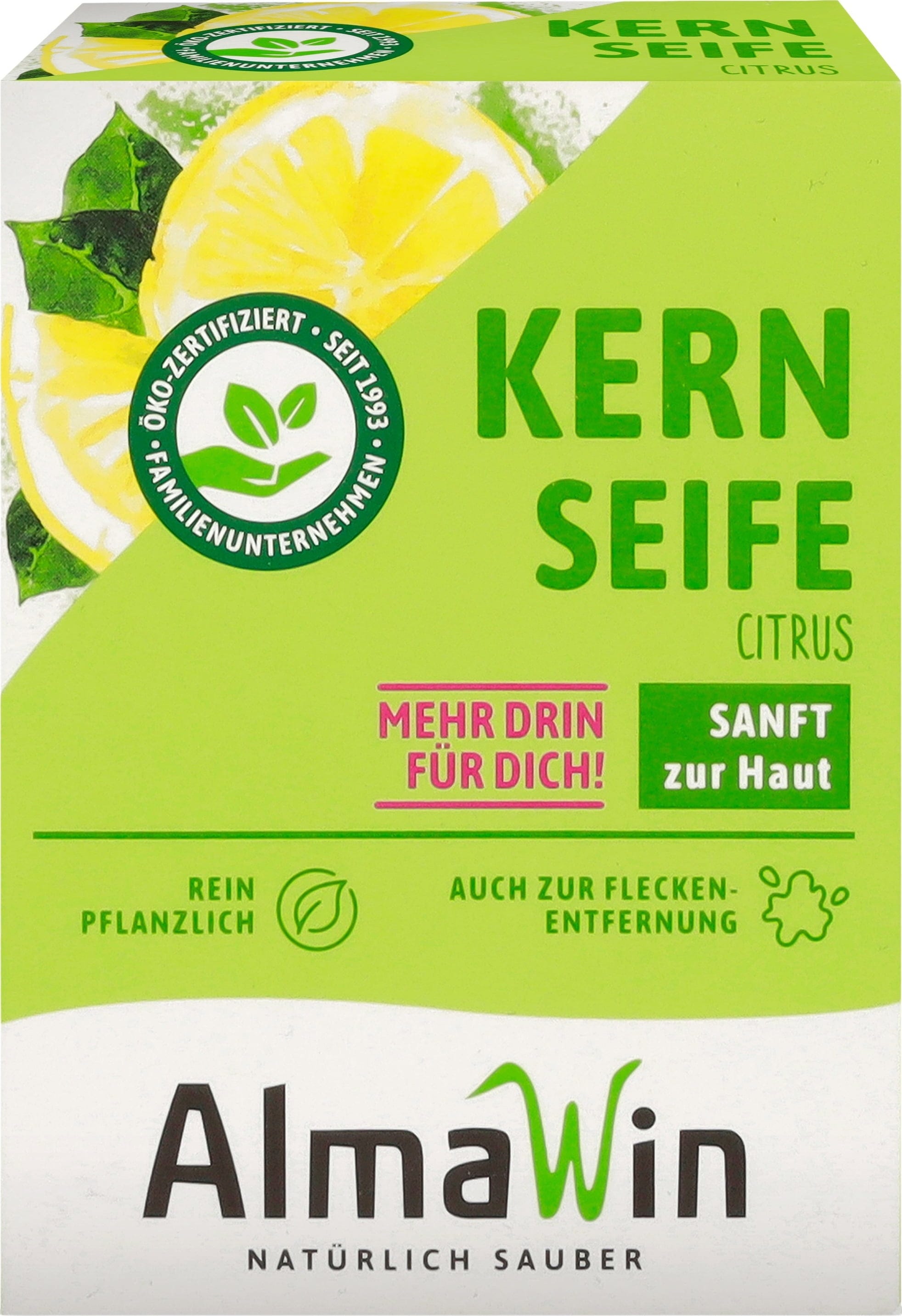 Die Kernseife von Almawin überzeugt durch beste Qualität in Sachen Umweltschonung, Dermatologie und Leistungsstärke. Das Produkt ist hautschonend und wurde dermatologisch getestet. Die Basis der Rezeptur besteht aus ausgewählten pflanzlichen und mineralischen Rohstoffen - meist aus kontrolliert biologischem Anbau. Man kann die Kernseife für die normale Körperpflege oder zur Fleckenbehandlung verwenden.
