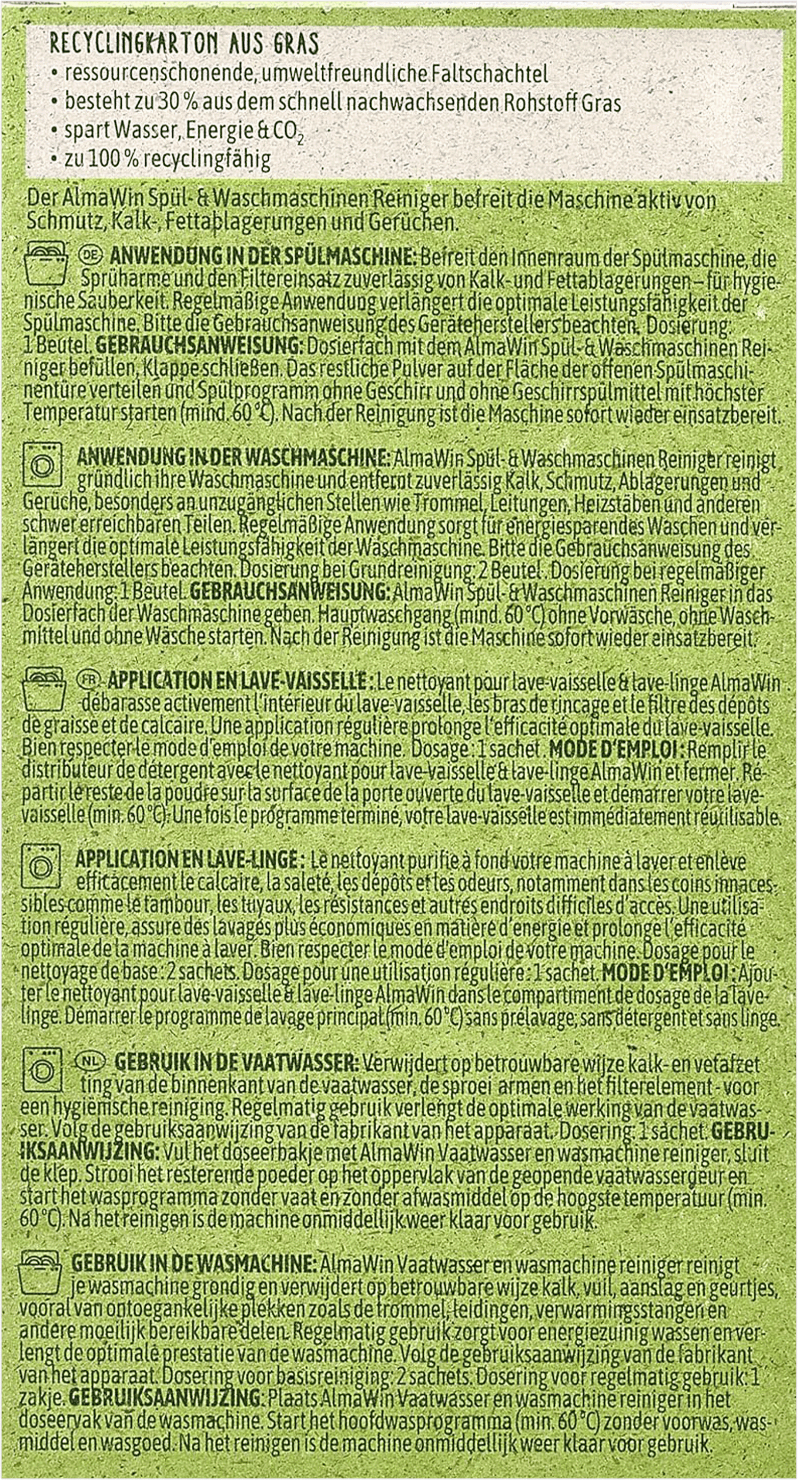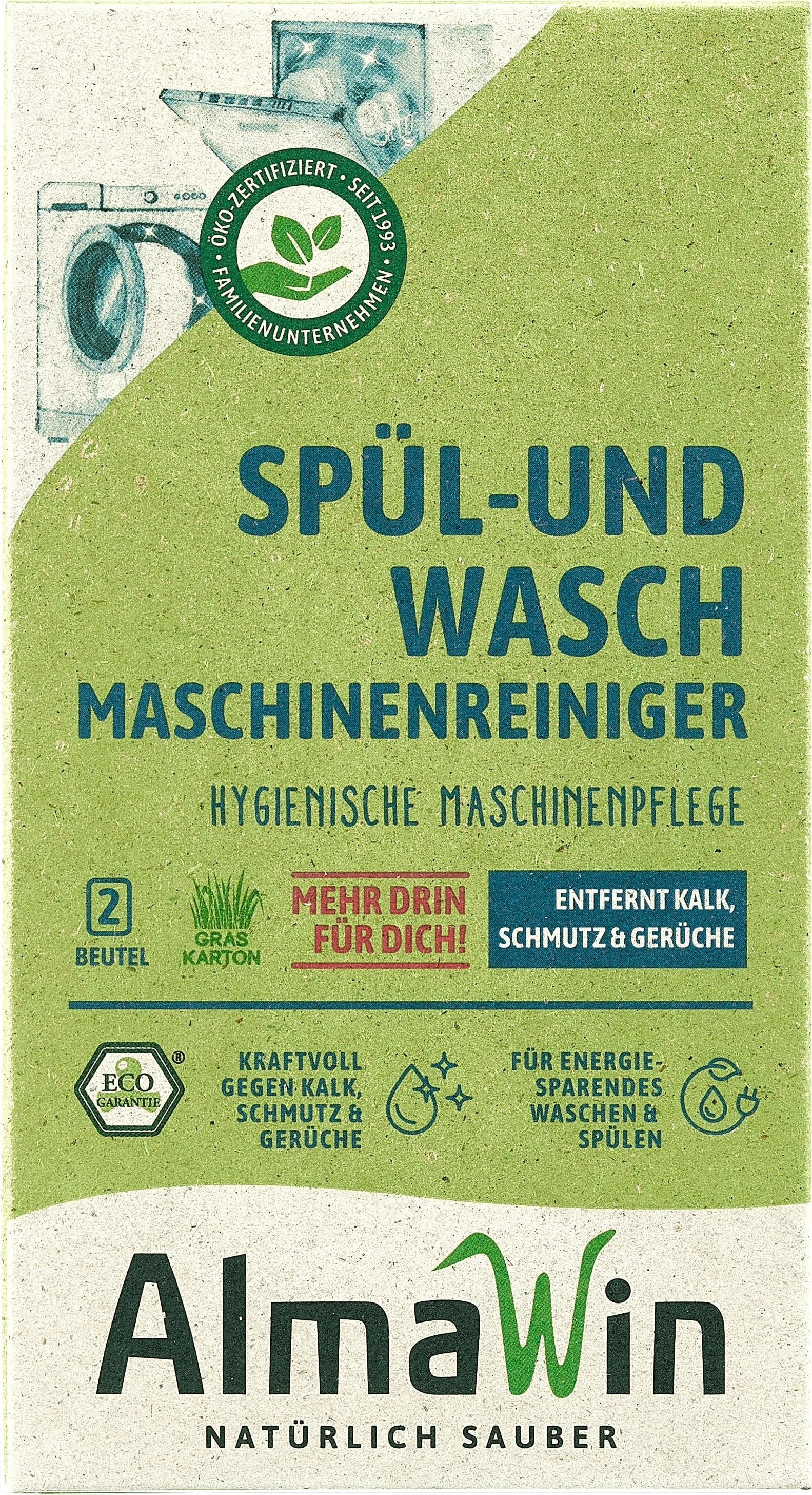 Der Spül- & Waschmaschinenreiniger von AlmaWin entfernt Schmutz-, Fett- und Kalkablagerungen sowie Gerüche und pflegt Gummi- und Metallteile. Basierend auf rein natürlichen Inhaltsstoffen ist er gut biologisch abbaubar und sorgt für hygienische Sauberkeit in den Maschinen, auch an unzugänglichen Stellen.