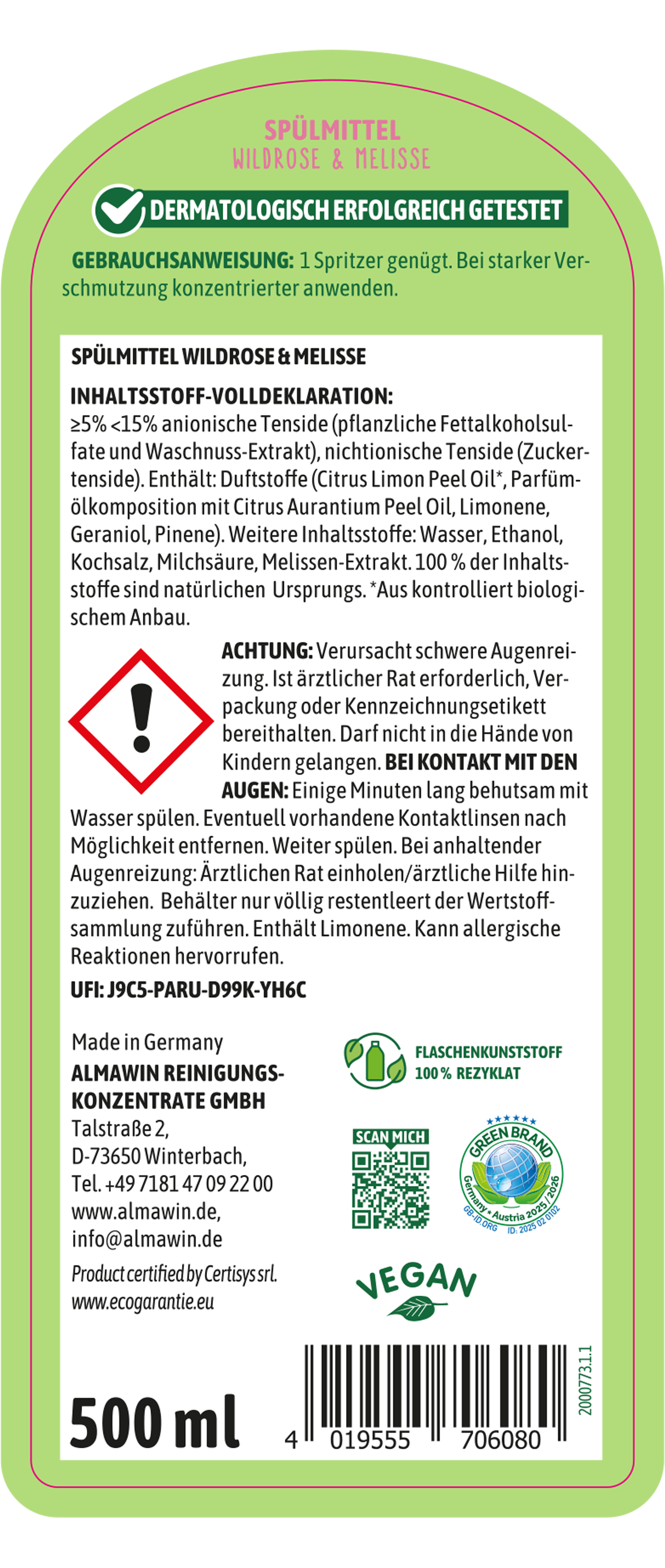 AlmaWin Spülmittel Wildrose Melisse, 500 ml
