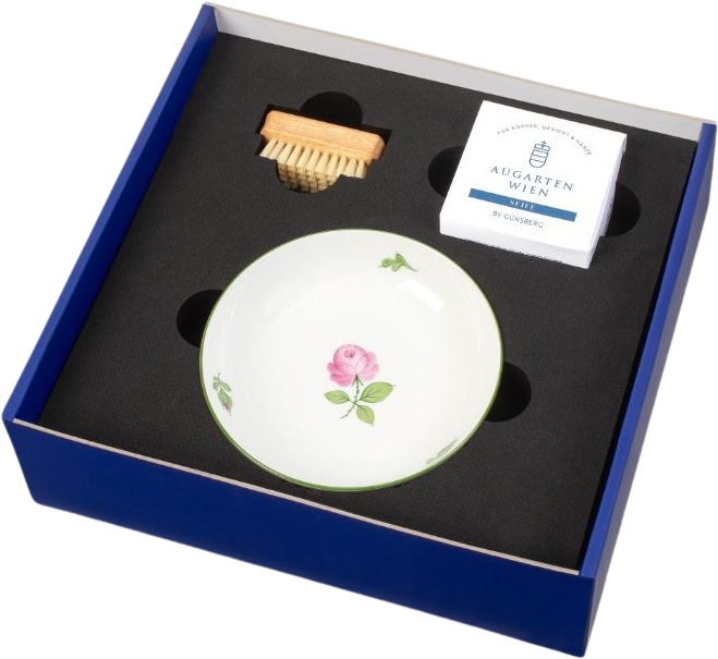 Dieses entzückende und liebevoll zusammengestellte Set verzaubert jedes Badezimmer. Die Seifenschale aus handgefertigtem und kunsvoll bemalten Porzellan, stammt aus der berühmten Augarten-Serie "Wiener Rose". Die beiliegende Seife verzaubert mit dem neuen Wiener Augarten Duft aus dem Hause Günsberg. Ein Nagelbürstchen rundet das Set stimmig ab.