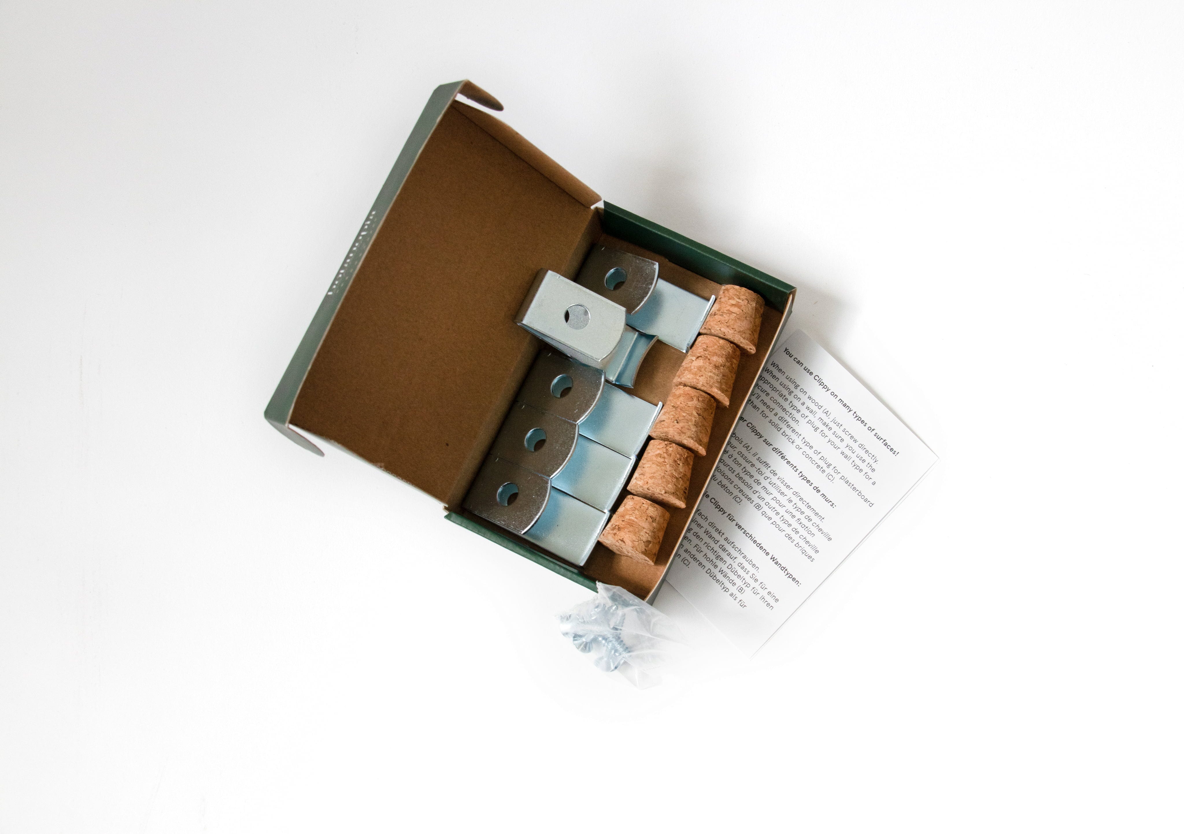 - Inhalt: 5 Stahlklammern, 5 Korkdübel, 5 Befestigungsschrauben
