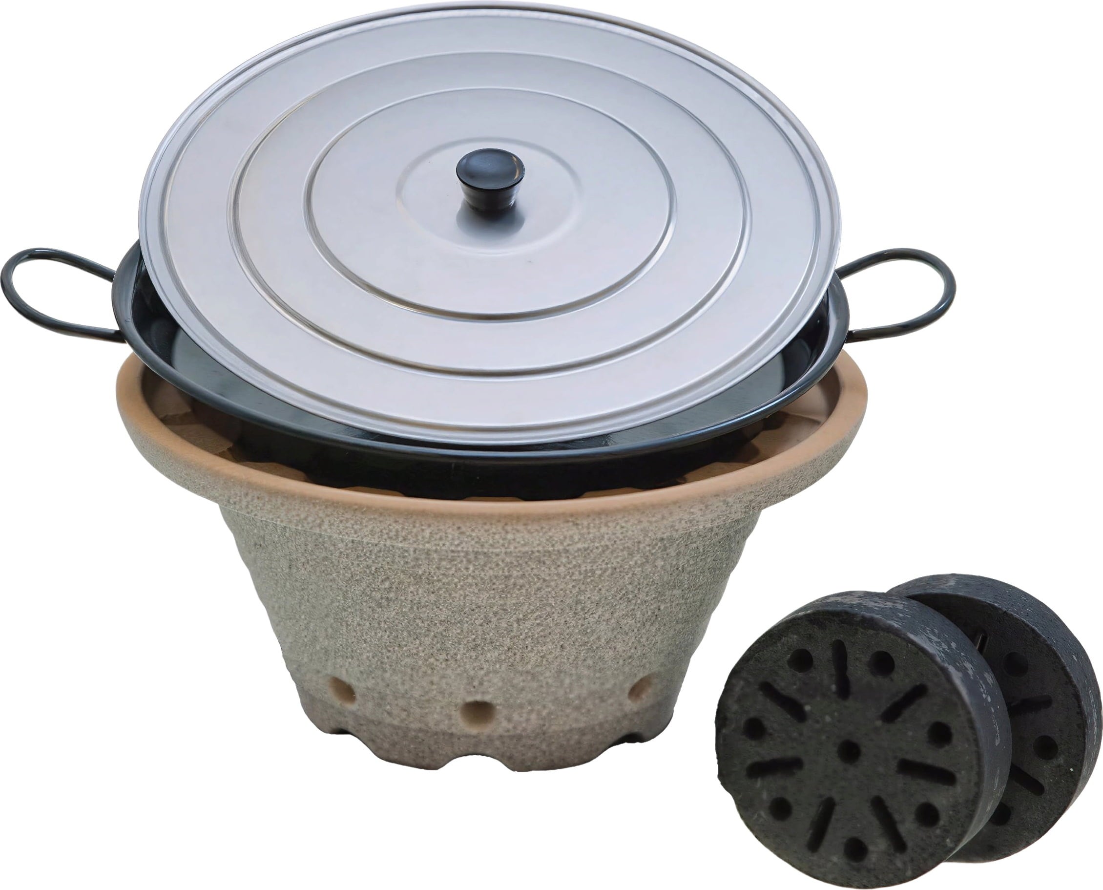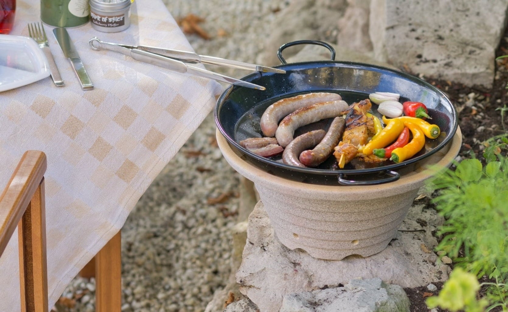 Lieferumfang: Bratfeuer, Schale CeraFlam® mit Granicium® beschichtet, Bratpfanne aus emailliertem Stahl, Aluminiumdeckel, Edelstahl-Ascherost, 2 x Schnellbriketts
