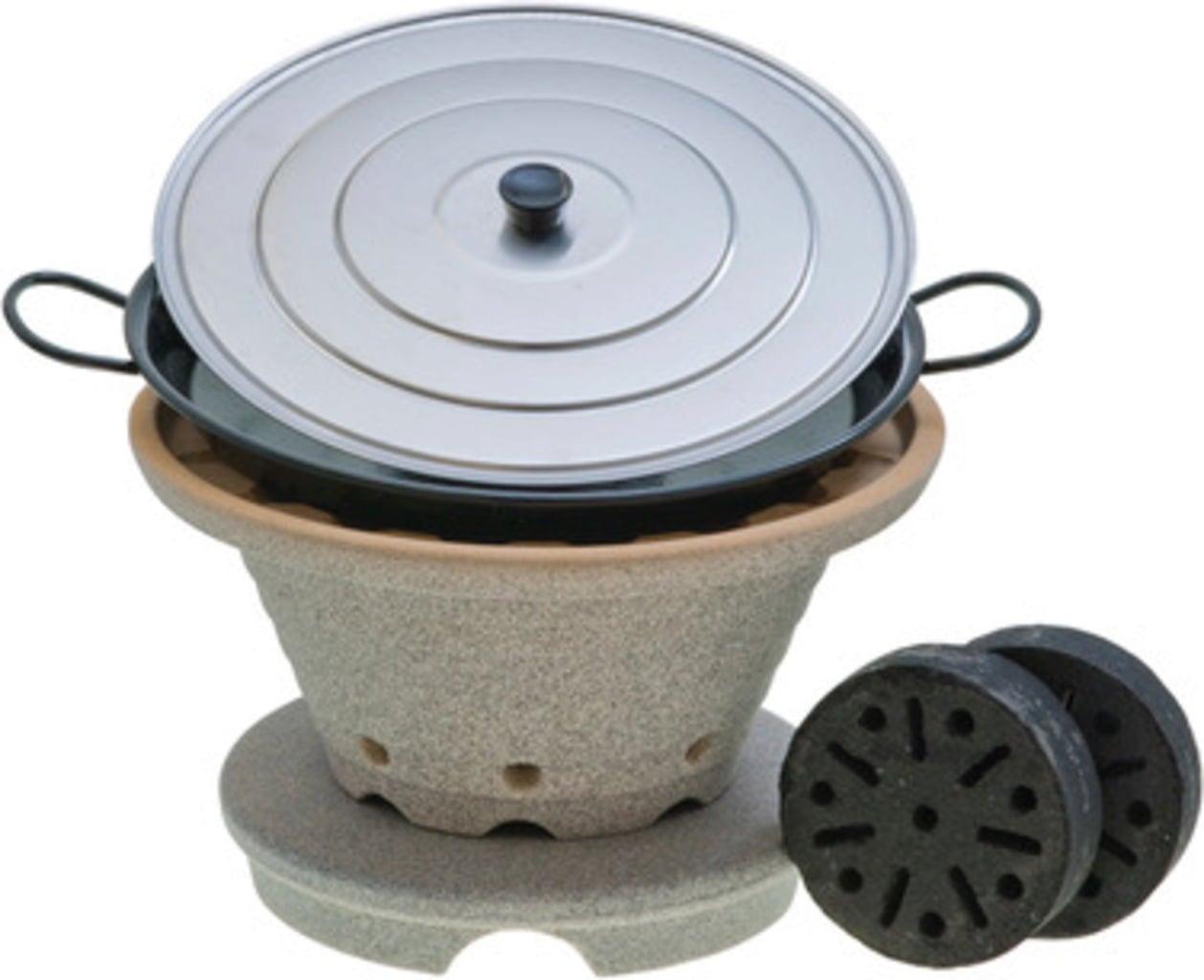Lieferumfang: Bratfeuer, Untersatz, Schale CeraFlam® mit Granicium® beschichtet, Bratpfanne aus emailliertem Stahl, Aluminiumdeckel, Edelstahl-Ascherost, 2 x Schnellbriketts