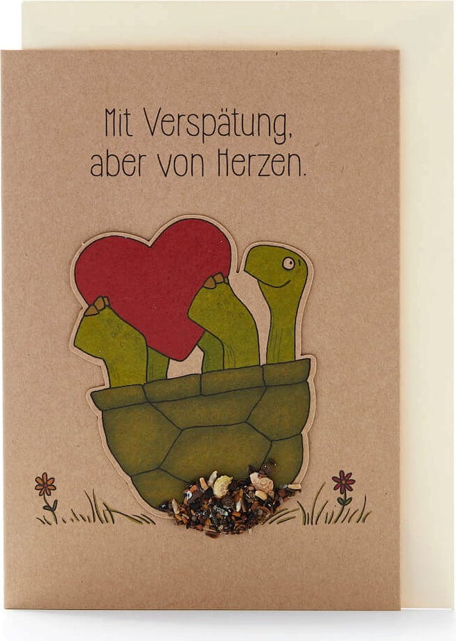 Da Schildkröten leider nicht zu den Schnellsten gehören, kann es schon einmal etwas länger dauern, bis Glückwünsche ankommen. Umso größer ist dann jedoch die Freude, wenn der Überbringer so süß ist wie auf dieser Karte. Und das Beste daran: Die kleine Schildkröte bringt neben Glückwünschen auch jede Menge Saatgut, aus dem die schönsten Wildblumen wachsen. Löse die Schildkröte einfach von der Karte, stecke sie in Erde und gieße gut an. Schon nach kurzer Zeit sollten sich die ersten zarte Triebe zeigen.