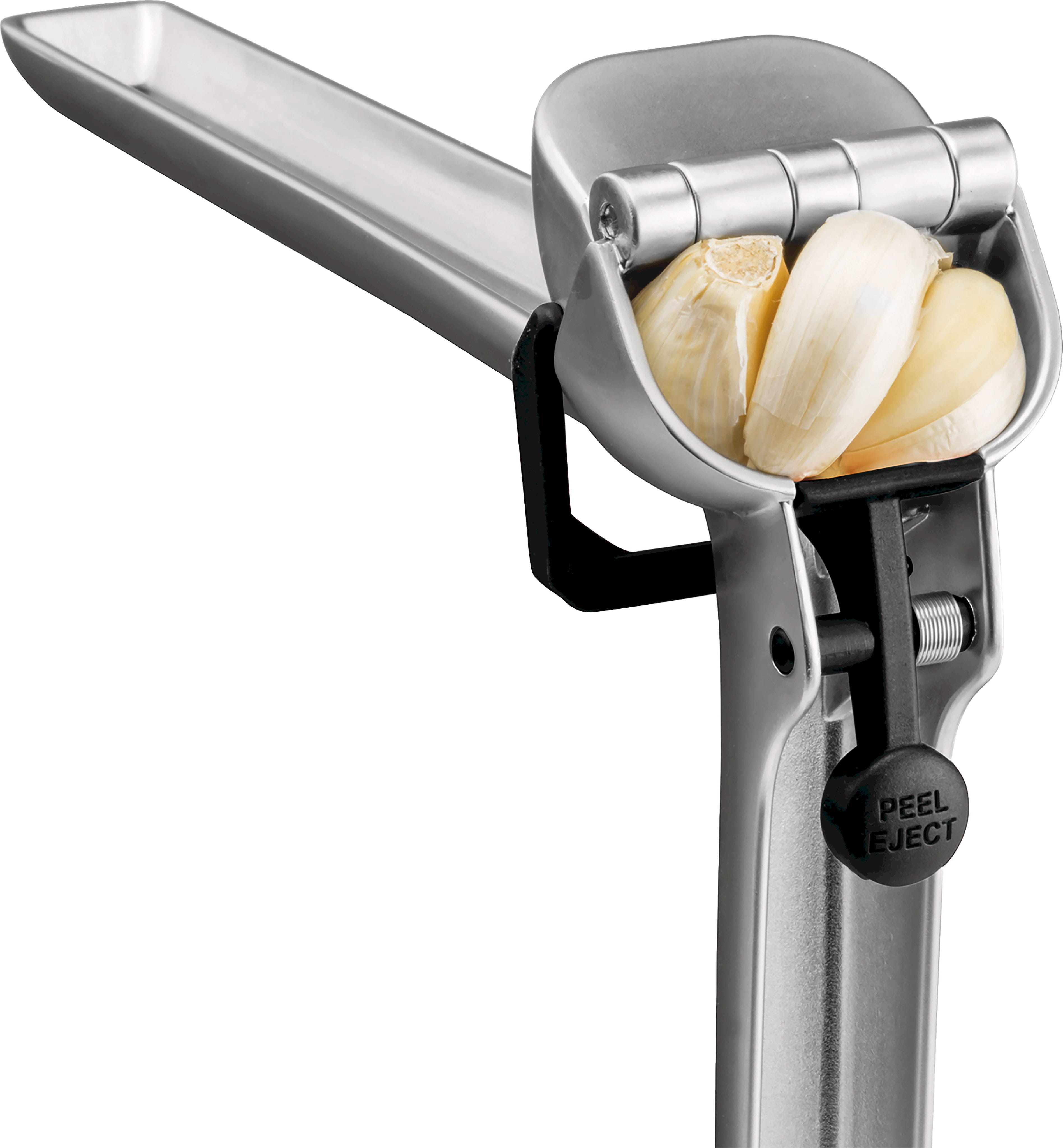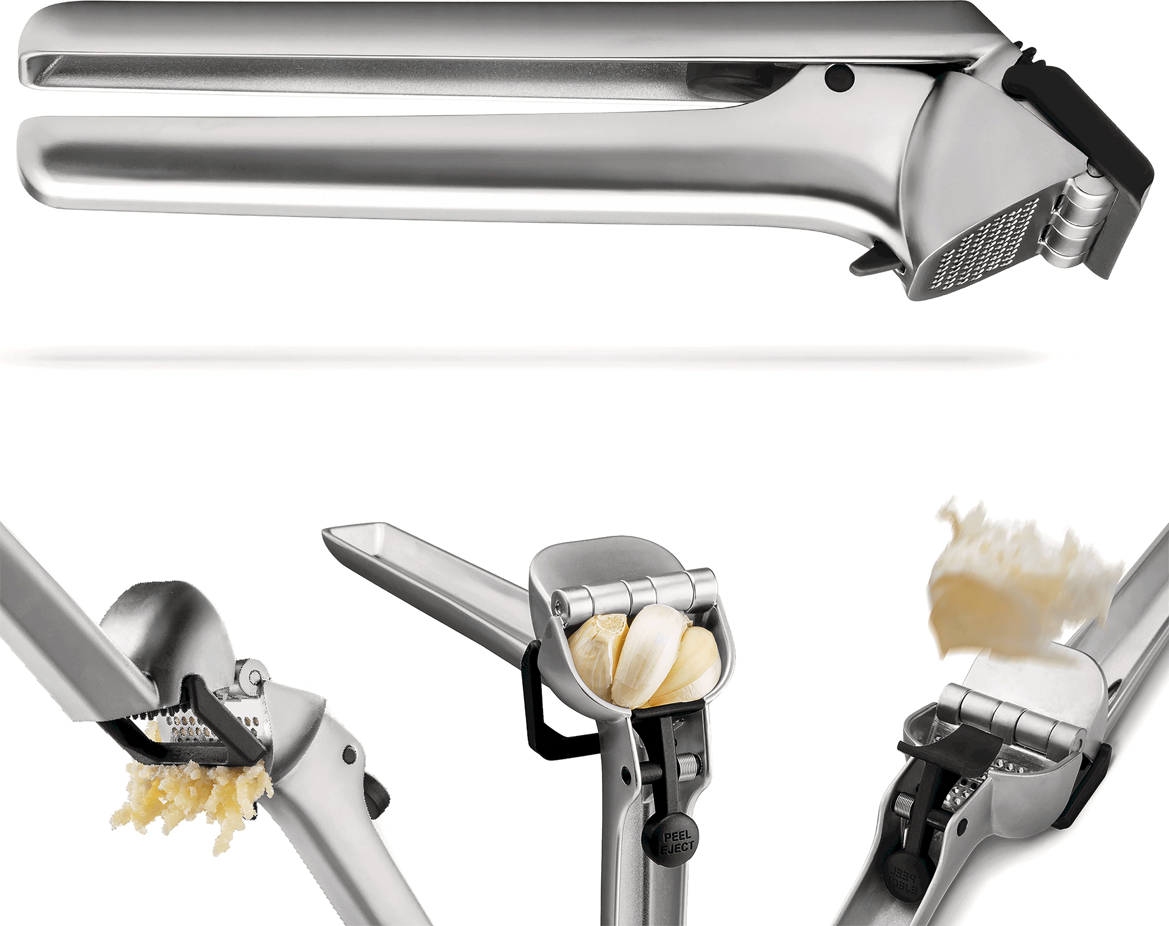 Beim Öffnen entfernt ein automatischer Schaber alle Pressrückstände von der Innenseite, während der clevere „Peel Eject“-Knopf die Schalen mit Leichtigkeit vollständig herauskatapultiert. So bleibt kein Geruch an deinen Händen, und die Presse ist nach kurzem Abspülen sofort wieder einsatzbereit!