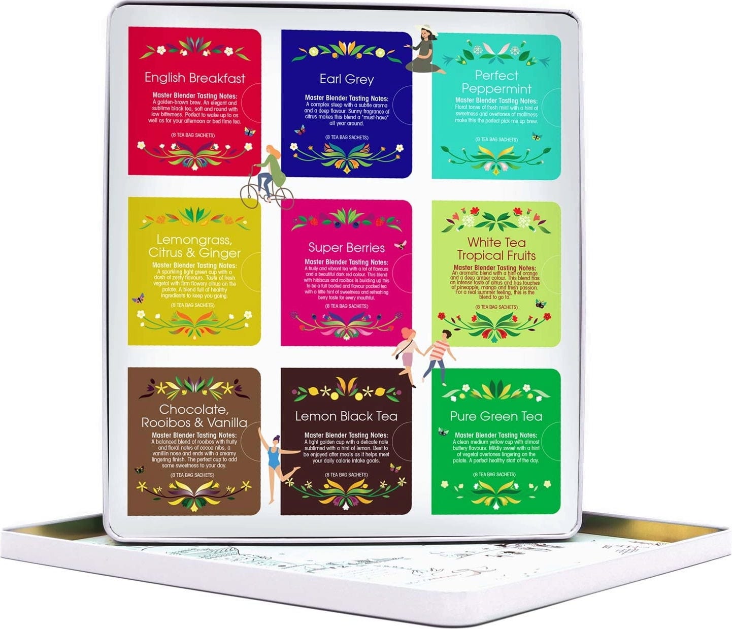 Jede Sorte ist mit 8 Beuteln vertreten - es kann also nach Herzenslust probiert, geteilt, getauscht und verglichen werden! Die liebevoll gestaltete Geschenkebox ist aus geprägtem Metall, sorgt für Ordnung in jeder Teeküche und kann immer wieder neu befüllt werden. Insgesamt sind 72 Aufgussbeutel enthalten.