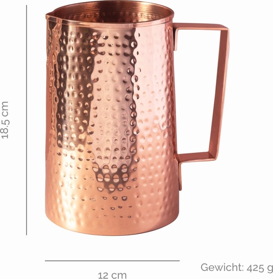 Dieser Kupferkrug ist ideal zum Servieren von stillem Wasser oder kann alternativ auch zur stilvollen Blumenvase umfunktioniert werden. Der Krug aus lebensmittelechtem Kupfer wird in Indien in liebevoller Handarbeit hergestellt und kombiniert damit modernes Design mit traditioneller Handarbeit. Außen mit einem lebensmittelsicheren Lack beschichtet und innen naturbelassen, sorgt der Krug für natürlich alkalisches Wasser.