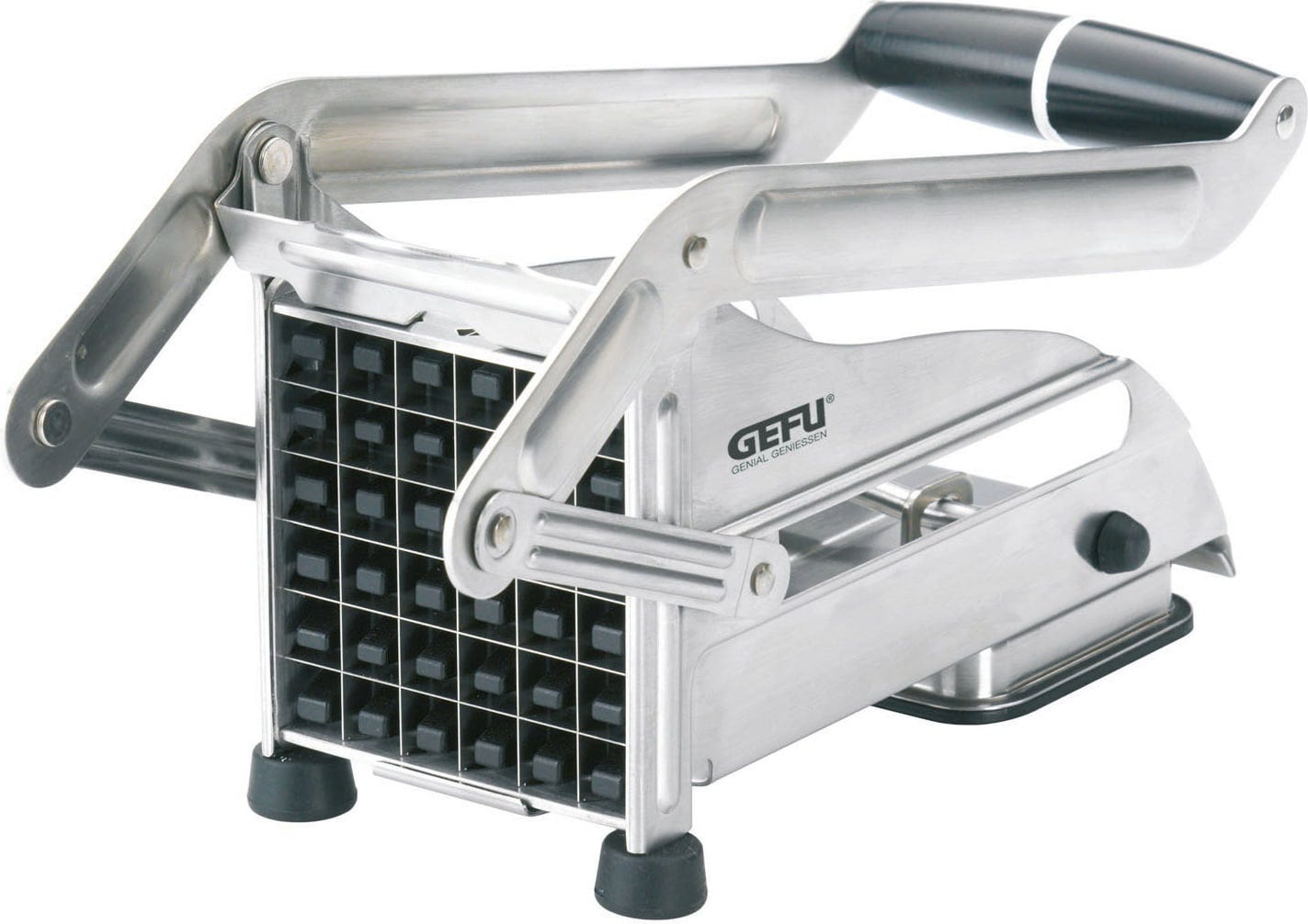Kreiere deine eigenen Snacks und Beilagen in beeindruckender Gleichmäßigkeit – mit dem Pommes- und Gemüseschneider CUTTO bringst du den Selbstmach-Trend direkt zu dir nach Hause! Lege dein Gemüse oder deine Kartoffeln ein, drücke den stabilen Hebel hinunter und schon zaubern die geschärften Stahlmesser 36 absolut gleichmäßige Stifte von 12 x 12 mm. Der integrierte Ausstößer sorgt dafür, dass die Sticks automatisch sauber durch das scharfe Gitternetz herausgedrückt werden.