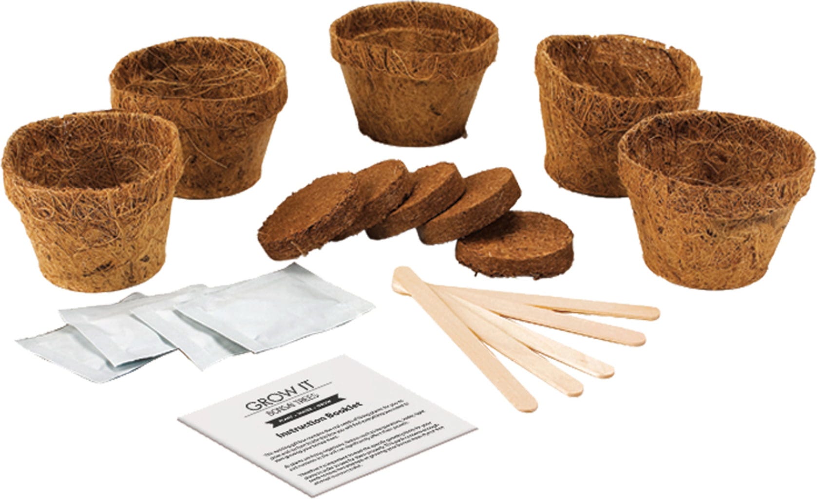 Inhalt: Starter-Blumentöpfe aus Kokosfaser, Düngerpads, Marker & Samen für 5 Pflanzen