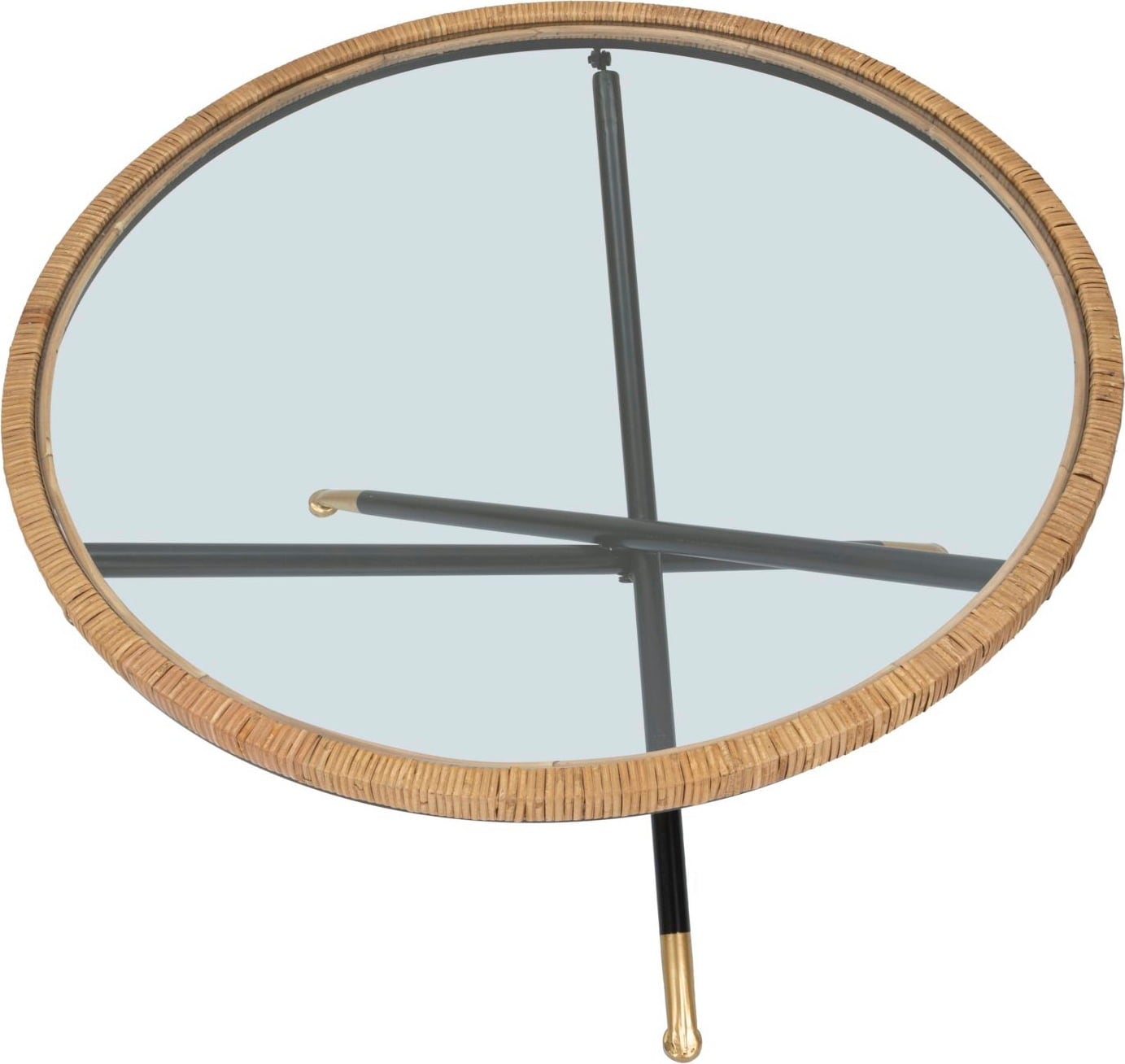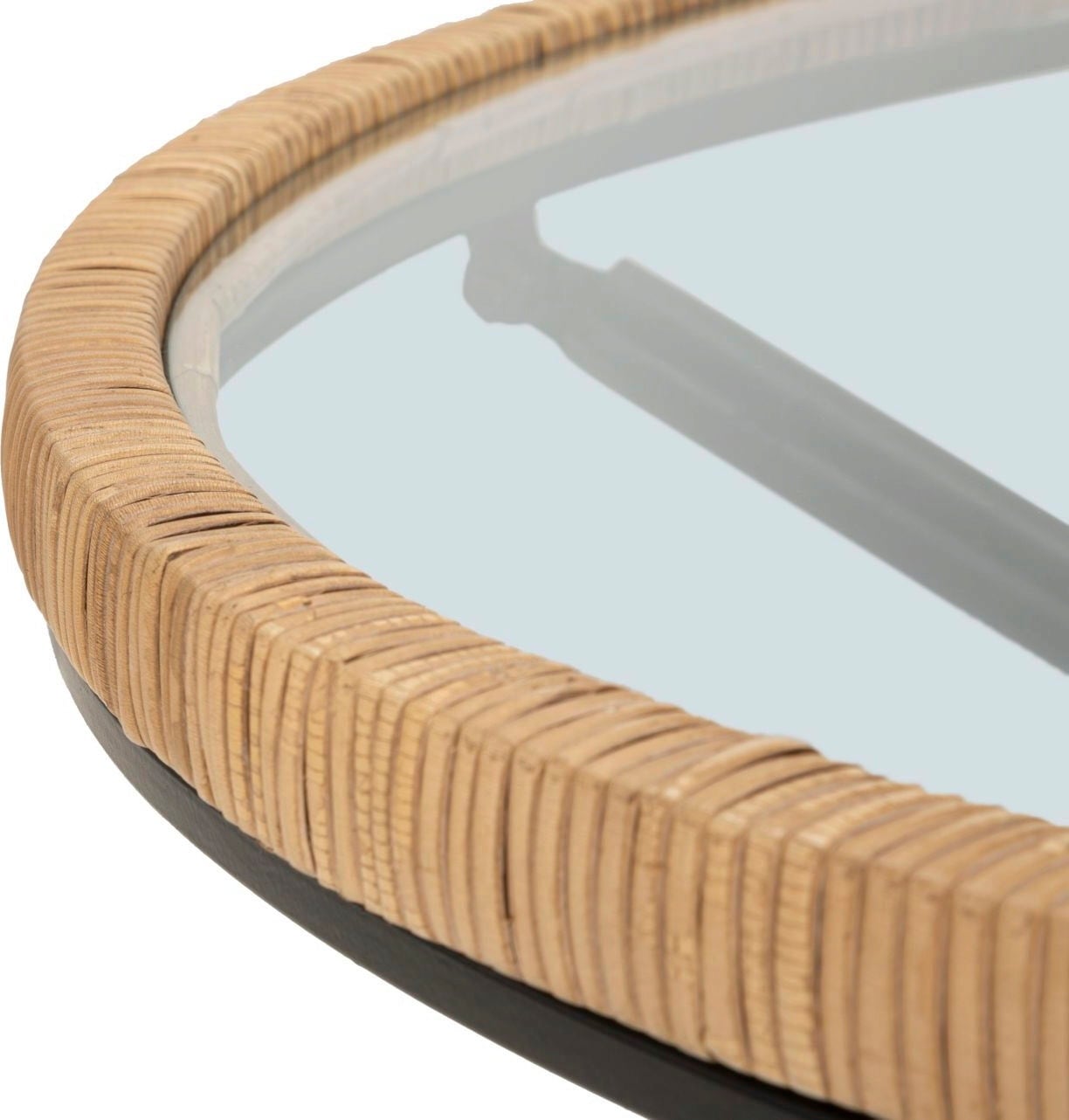 Verleihe deinem Wohnzimmer mit diesem runden Couchtisch ein schlichtes, aber ansprechendes Design-Upgrade! Er vereint die klare Transparenz einer runden Glasplatte mit der warmen, natürlichen Textur eines Rattan-Geflechts, das die Platte stilvoll umrandet. Das robuste, schwarze Metallgestell mit seinen X-förmigen Beinen sorgt für hohe Stabilität und einen modernen Kontrast.