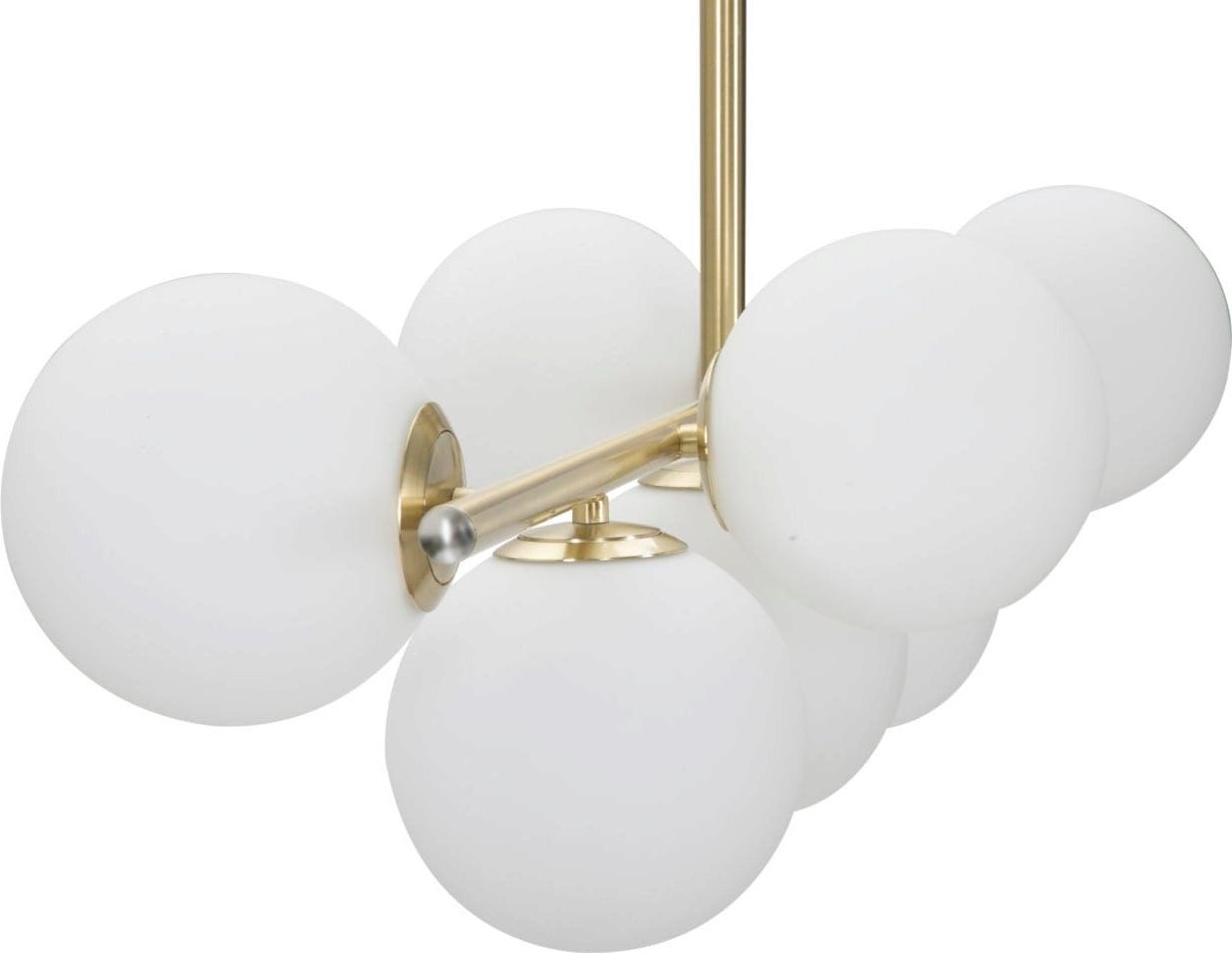 Das Gestell aus goldfarbenem Metall besticht durch seine klaren, essentiellen Linien, an denen die sieben weißen Glaskugeln in einer harmonischen, leicht versetzten Reihe angeordnet sind. Diese Kombination aus edlem Gold-Finish und sanftem, diffusem Licht der Glaskugeln erzeugt eine einzigartige Atmosphäre von Raffinesse und Wärme. Ob über dem Esstisch oder als zentrales Element im Wohnzimmer – die Glamy setzt ein stilvolles Statement für exklusives Wohndesign!