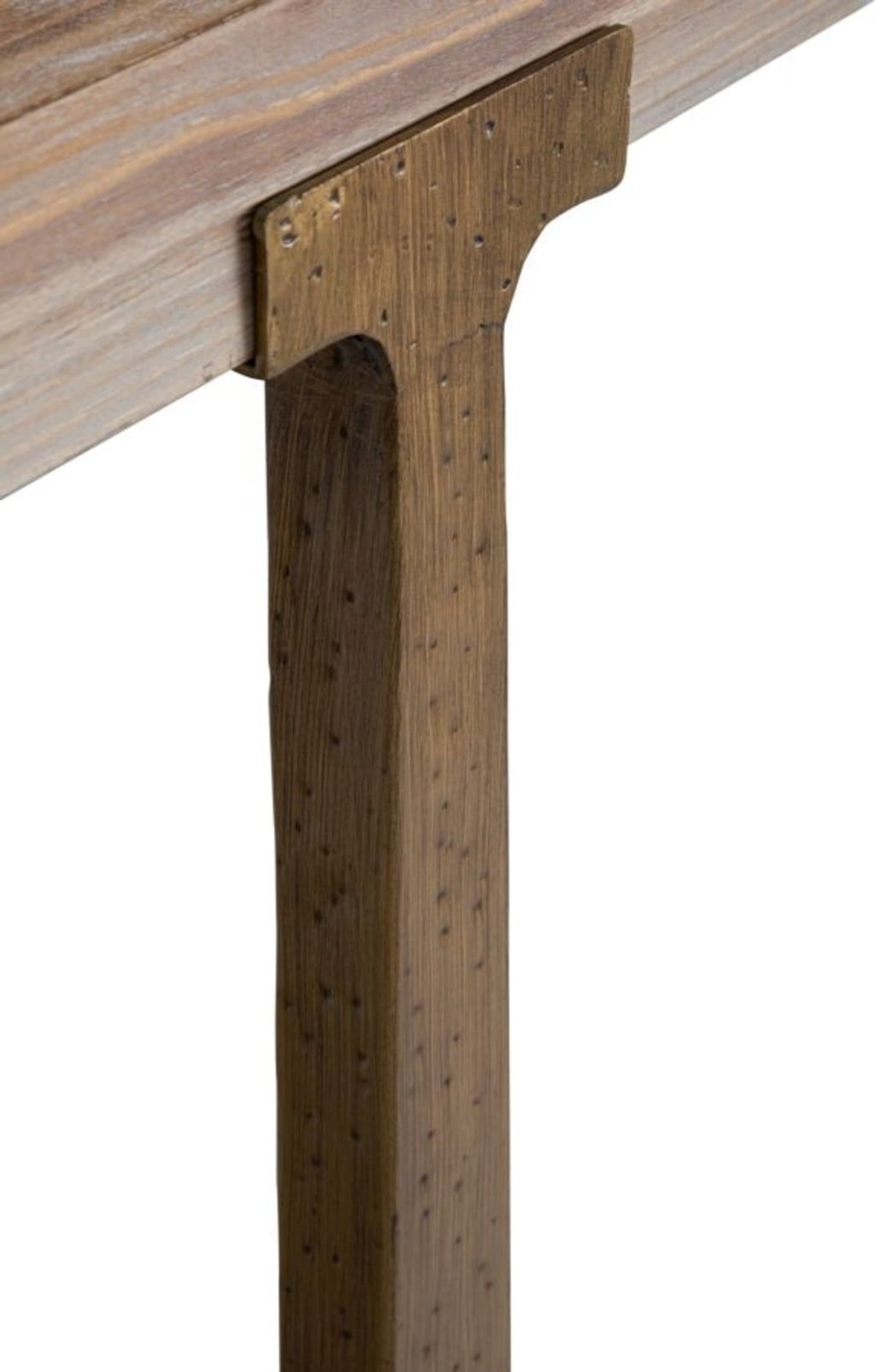 Im Kontrast dazu steht das kantige Metallgestell in einem dunkleren Bronze-Ton. Dieses Gestell sorgt nicht nur für höchste Stabilität, sondern verleiht dem Tisch auch einen kühlen, industriellen Touch. Dieser Tisch ist das ideale Herzstück für dein modernes Zuhause, das Wert auf klare Formen und charaktervolle Materialien legt!