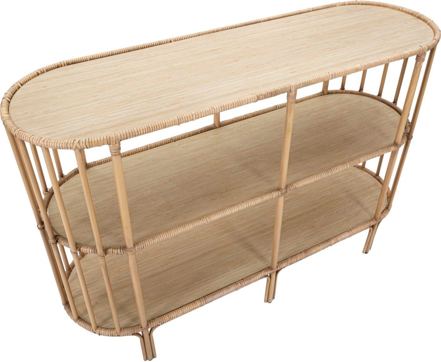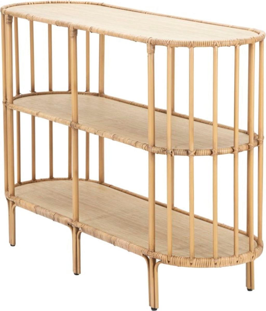 Das Besondere ist das durchgehend abgerundete Design: Die weichen Linien der Seitenwände harmonieren perfekt mit den drei großzügigen Ablageflächen. Dank der offenen Struktur und der filigranen vertikalen Verstrebungen wirkt das Möbelstück trotz seiner drei Etagen angenehm luftig und leicht. Ob im Flur als stilvolle Ablage oder im Wohnzimmer als Präsentationsfläche für deine Dekoration – die Konsole Panama ist die perfekte Ergänzung für jede Art von Einrichtung!