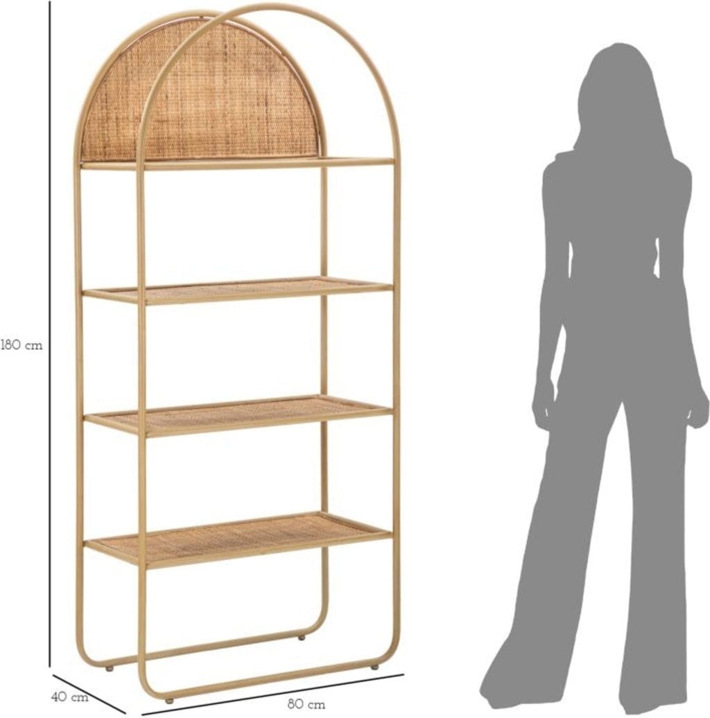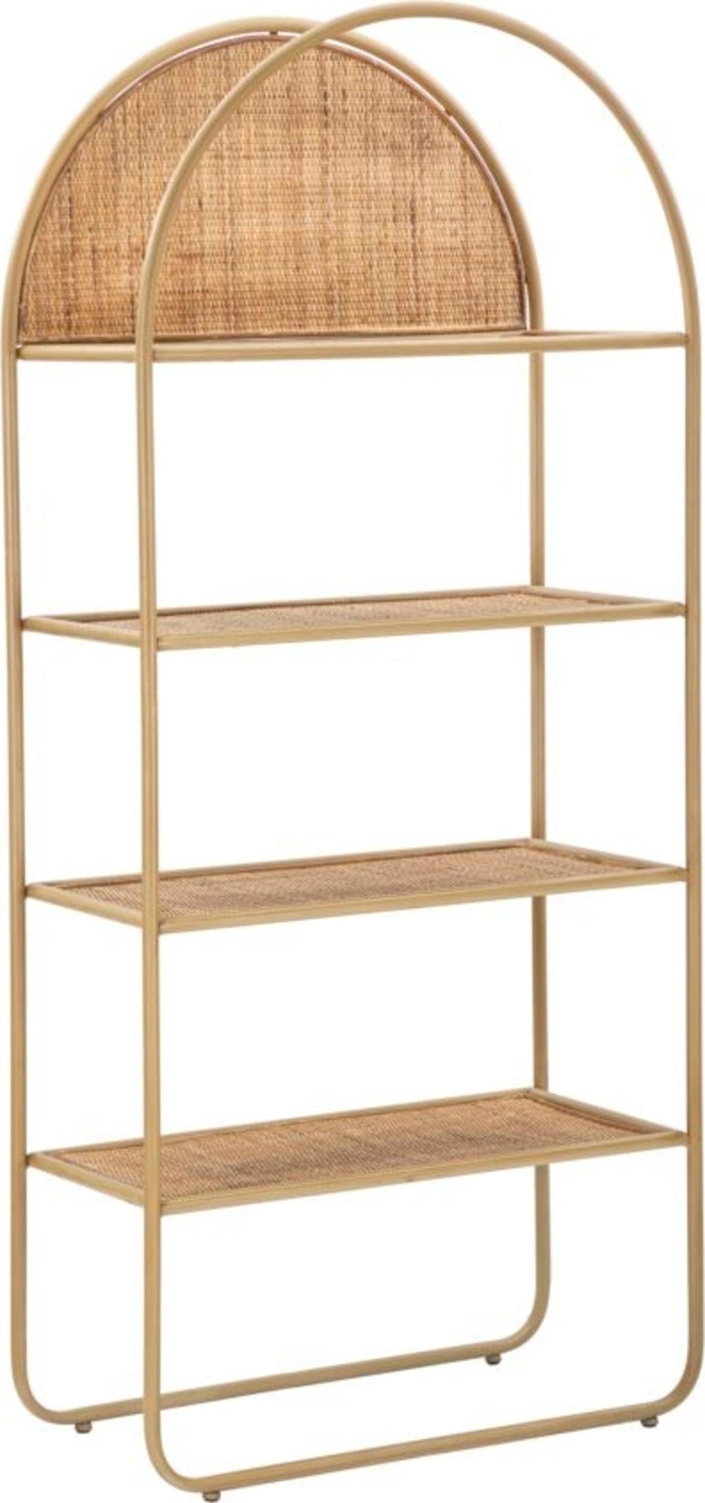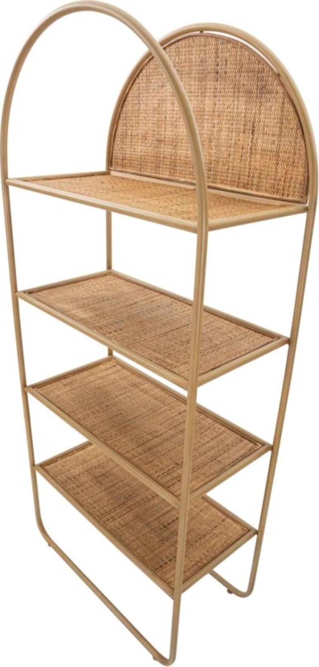 Das Regal bietet auf vier großzügigen Einlegeböden in feiner Rattan-Optik reichlich Platz für Bücher, Dekoration oder Pflanzen. Ein besonderer Blickfang ist die halbkreisförmige Rückwand im obersten Fach, die das Geflecht-Thema stilvoll betont. Dank seiner weichen, schlichten Linien und der luftigen Konstruktion ist es die perfekte Ergänzung für jede Art von Möbeln und verleiht jedem Raum eine einladende, wohnliche Atmosphäre.