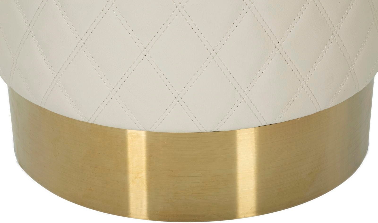 Verleihe deinem Raum einen Hauch von strahlender Opulenz und luxuriösem Design mit diesem eleganten Hocker. Der runde Korpus, bezogen mit cremeweißem Material, besticht durch eine feine, gesteppte Rautenstruktur, die ihm eine klassische und gleichzeitig moderne Textur verleiht. Das absolute Highlight ist der breite, glänzende goldene Metallsockel, der den Hocker stilvoll vom Boden abhebt und für einen markanten Glamour-Akzent sorgt.