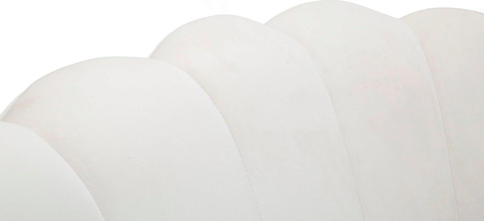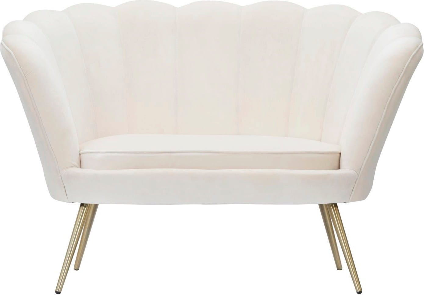Setze ein stilvolles Statement in deinem Wohn- oder Schlafzimmer mit diesem außergewöhnlichen Zweisitzer-Sofa! Das Design besticht durch eine Rückenlehne, die in ihrer geschwungenen Form an filigrane Blütenblätter erinnert. Der cremefarbene Samtbezug verleiht dem Möbelstück zudem eine edle Haptik sowie eine sanfte Optik!
