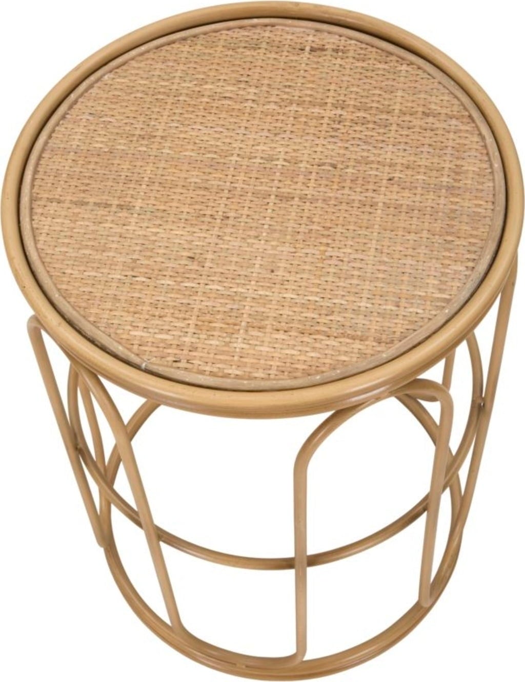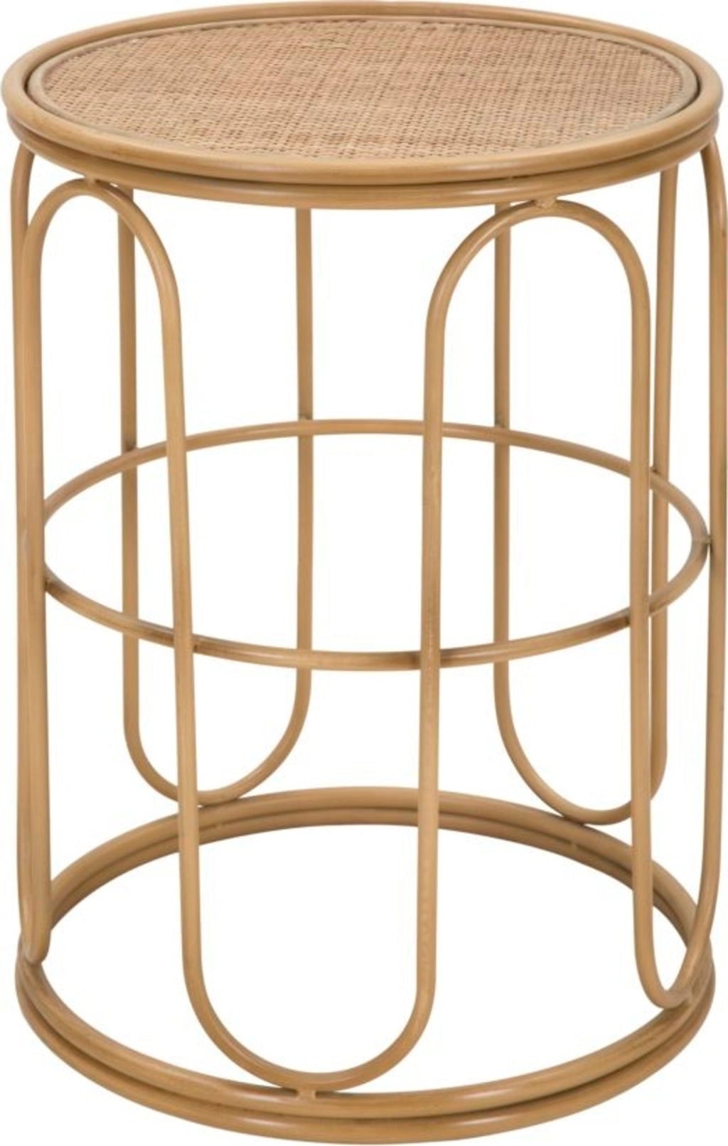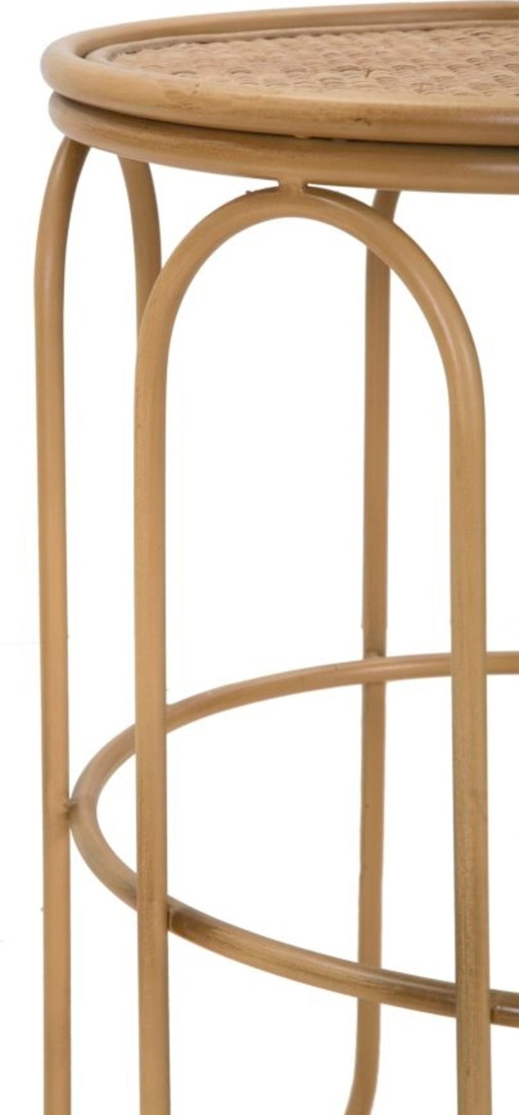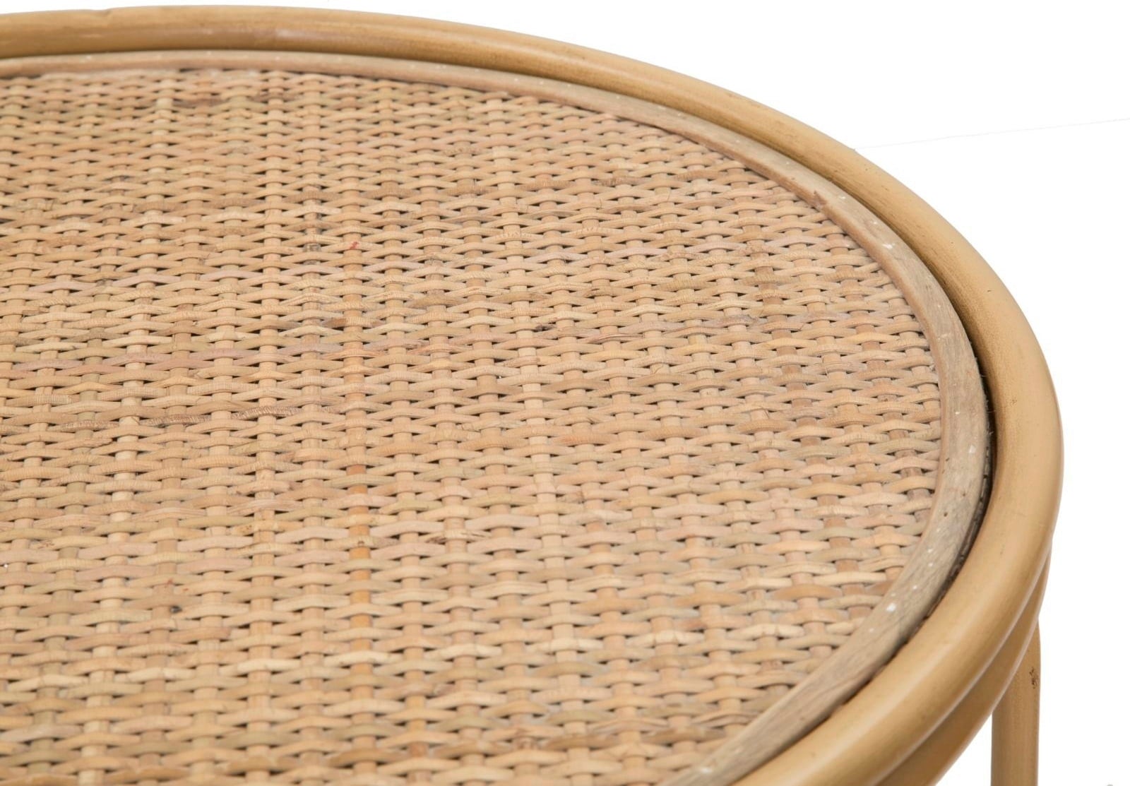 Verleihe deinem Raum eine warme, natürliche Atmosphäre mit diesem runden, niedrigen Beistelltisch. Das Design erinnert an klassische Flechtarbeiten und natürliche Materialien: Die Oberfläche besteht aus einer Tischplatte mit feinem Rattan-Geflecht. Getragen wird der Tisch von einem Metallgestell, dessen weiche, geschwungene Linien kunstvoll die Optik von Bambusrohren imitieren.