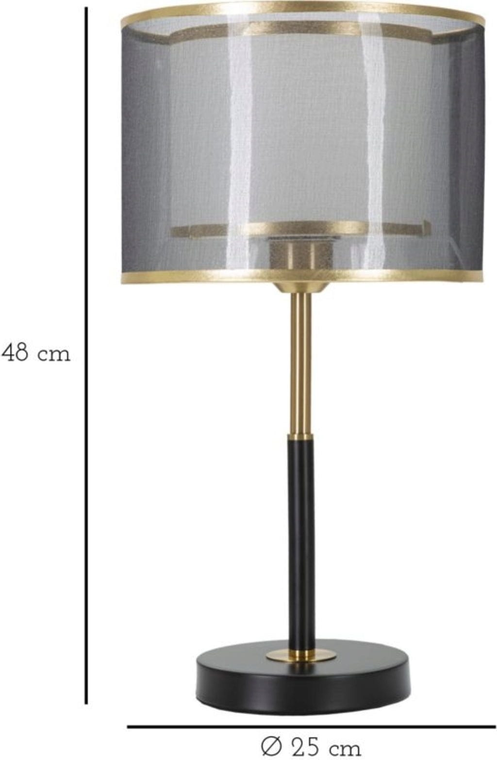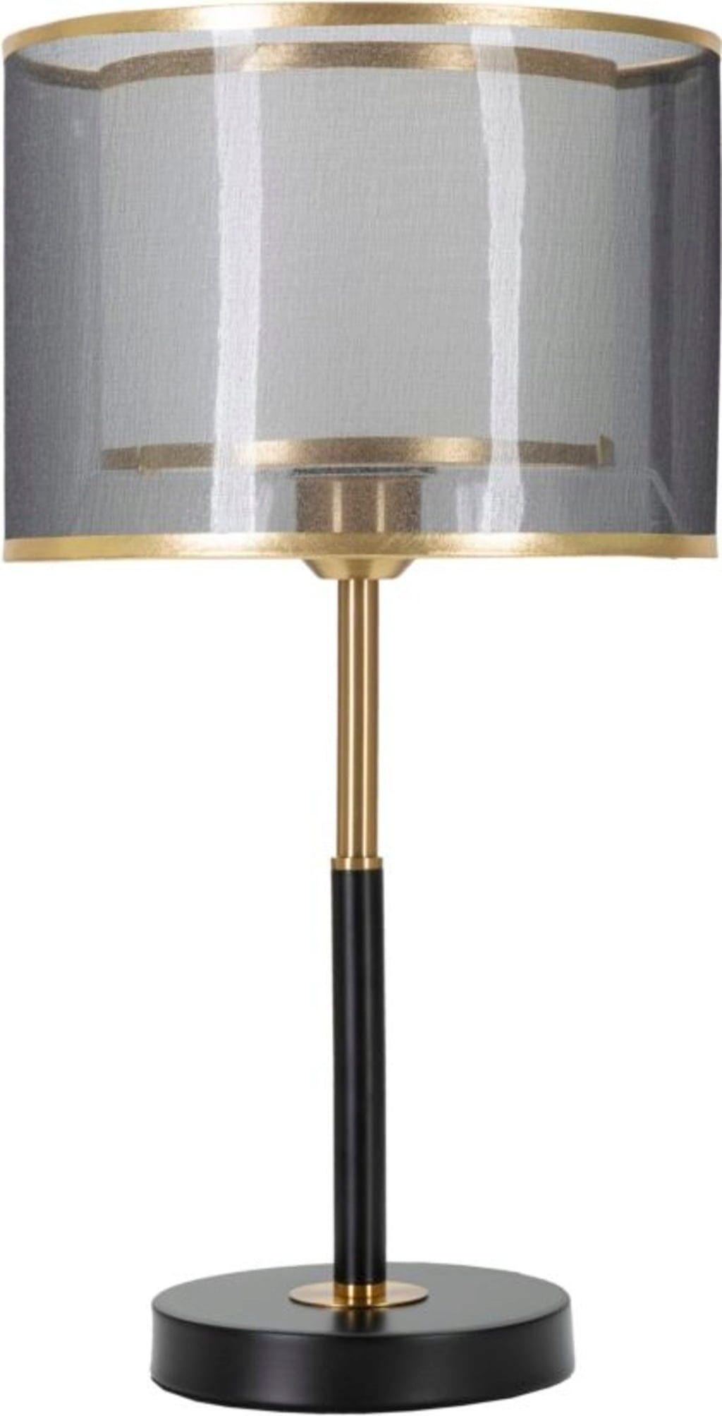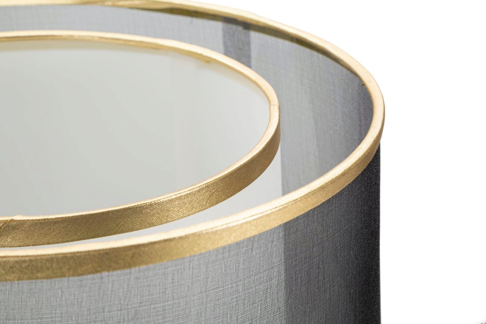 Das absolute Highlight ist der raffinierte, zweistufige Stofflampenschirm: Ein innerer weißer Schirm wird von einer äußeren, transparent-grauen Schicht umschlossen. Beide Ebenen sind mit einem eleganten goldenen Rand veredelt, der den luxuriösen Look perfekt abrundet. Das Zusammenspiel der Schichten sorgt für ein besonders sanftes, mehrdimensionales Licht, das jedem Raum eine behagliche und zugleich mondäne Atmosphäre verleiht.