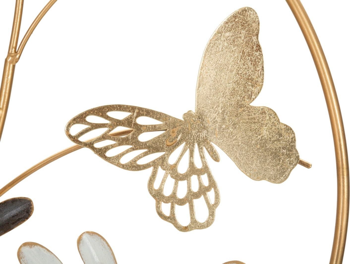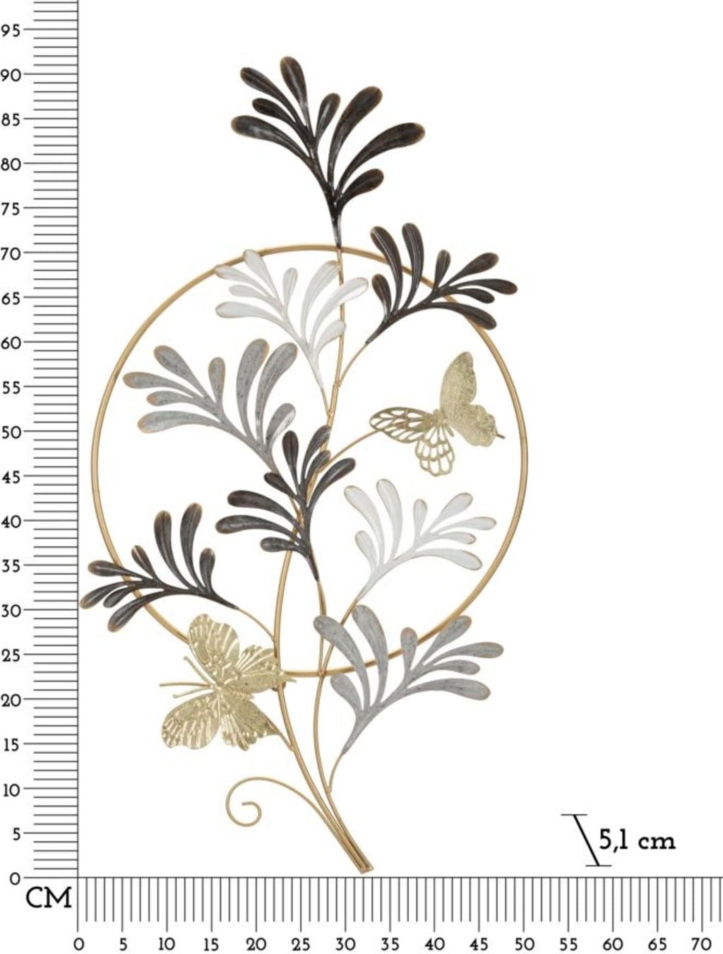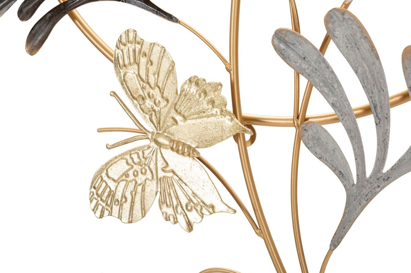 Verleihe deinem Zuhause eine poetische Note mit der Wanddekoration Lixy von Mauro Ferretti. Dieses dekorative 3D-Wandobjekt aus Metall zeigt einen kunstvoll gestalteten Ast mit stilisierten Blättern, die in sanften Nuancen von Weiß, Grau und dunklen Erdtönen gehalten sind. Eingefasst in einen runden, goldenen Rahmen, wird das Design durch zwei filigrane, goldfarbene Schmetterlinge ergänzt, die dem Arrangement eine besondere Leichtigkeit verleihen.