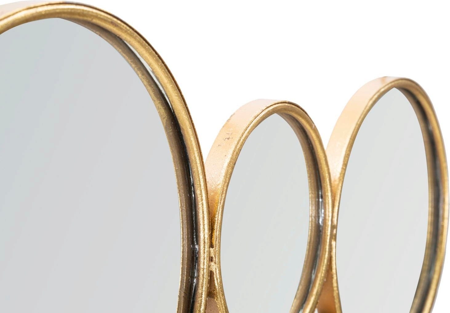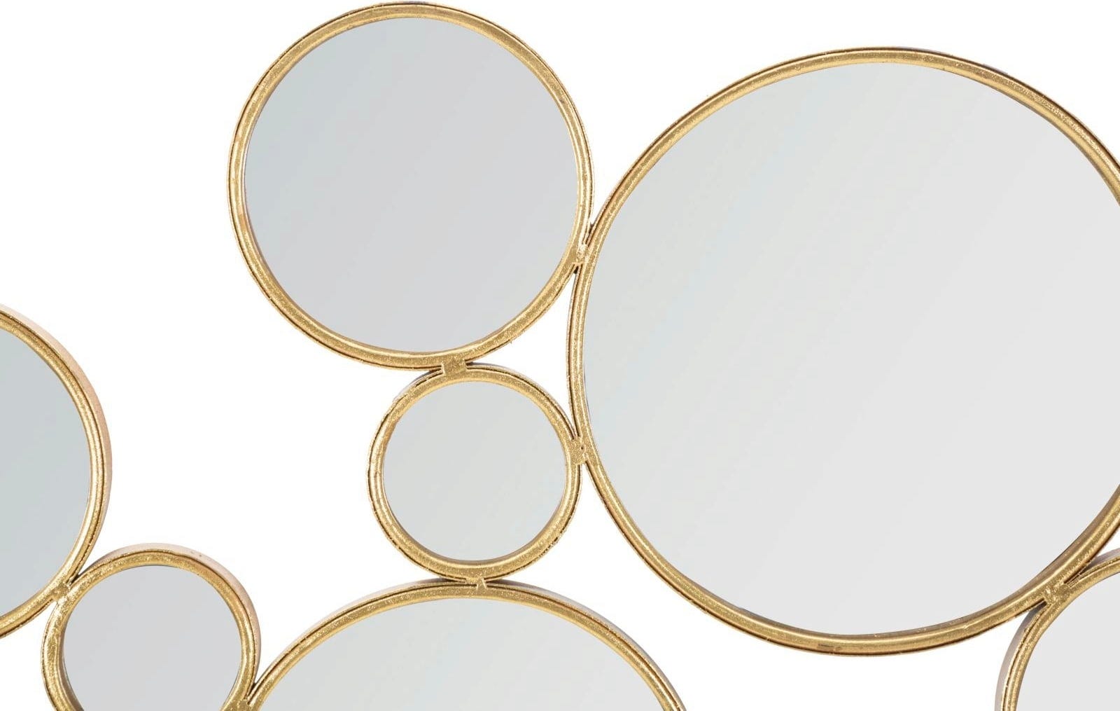 Mit der Wanddekoration Mirrors von Mauro Ferretti holst du dir ein echtes Design-Highlight nach Hause, das Eleganz und Leichtigkeit perfekt miteinander verbindet. Die kunstvolle Komposition aus zahlreichen runden Spiegeln in verschiedenen Größen wirkt wie eine Ansammlung schwebender Seifenblasen, die dein Zimmer optisch öffnen und für faszinierende Lichtreflexe sorgen. Jeder einzelne Spiegel ist von einem schlichten, goldfarbenen Rahmen eingefasst, der für eine luxuriöse Note sorgt, ohne dabei aufdringlich zu wirken.