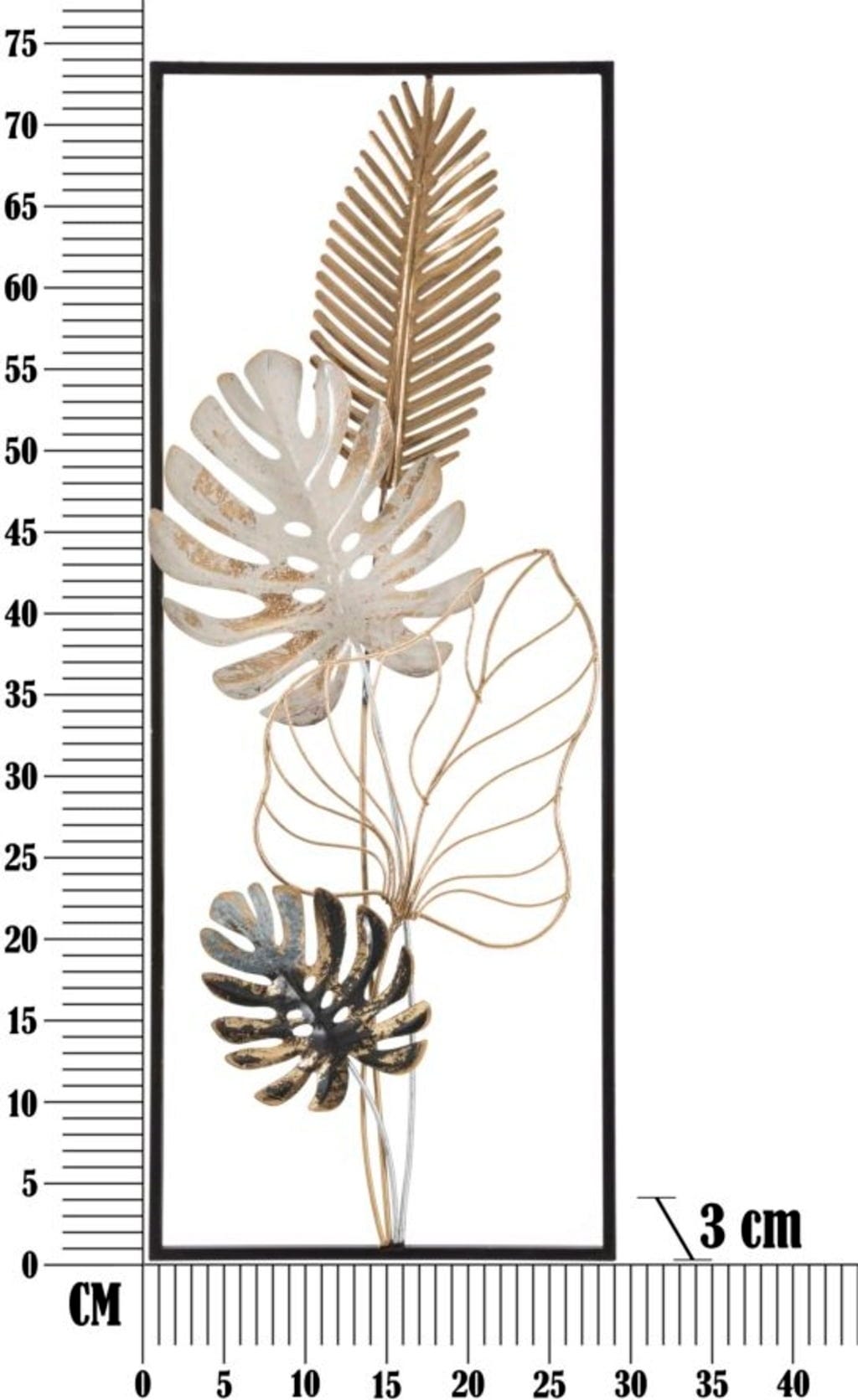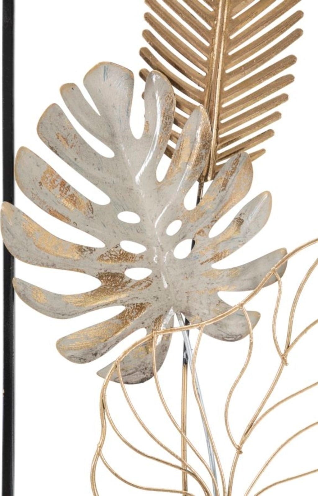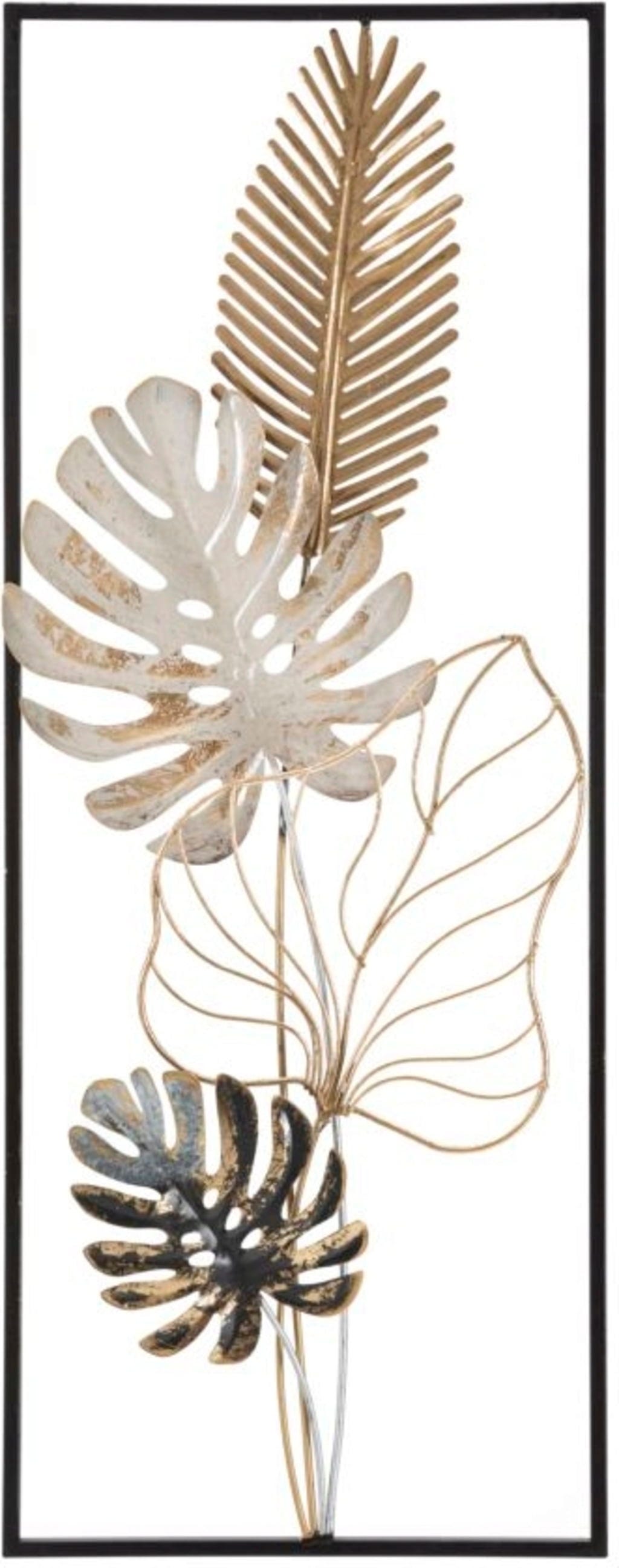 Mit der Wanddekoration Palm -B- von Mauro Ferretti holst du dir den angesagten Botanical-Trend in einer besonders luxuriösen Variante nach Hause. Dieses beeindruckende Metallpaneel bricht mit der klassischen flachen Wandgestaltung und setzt stattdessen auf eine faszinierende 3D-Optik, die sofort Tiefe und Leben in deine Räume bringt. Du wirst begeistert sein, wie die naturnahen Blattdesigns – von der filigranen Palme bis hin zum ikonischen Monstera-Blatt – in einem eleganten Mix aus Gold, sanftem Weiß und dunklen Akzenten miteinander harmonieren.