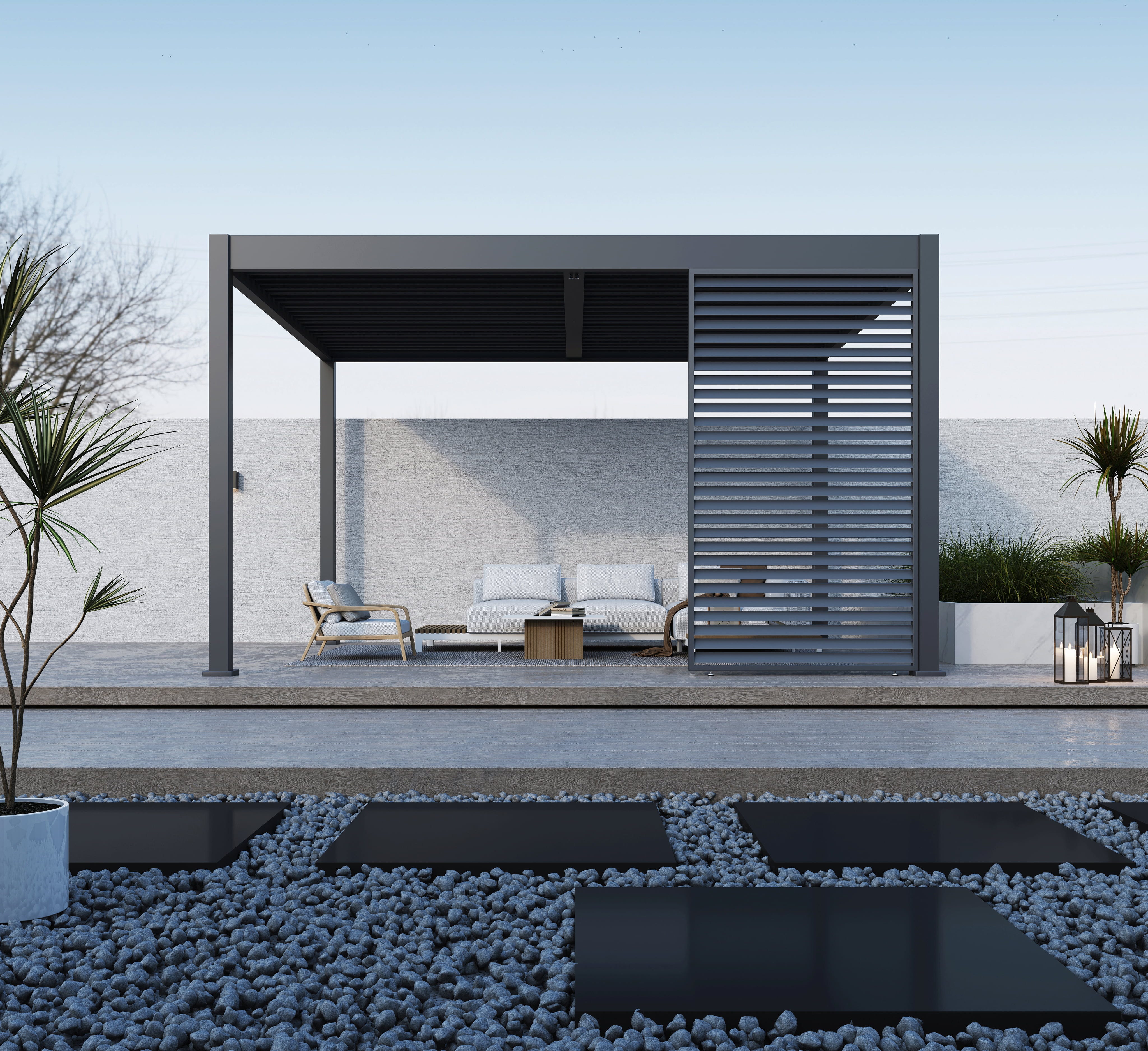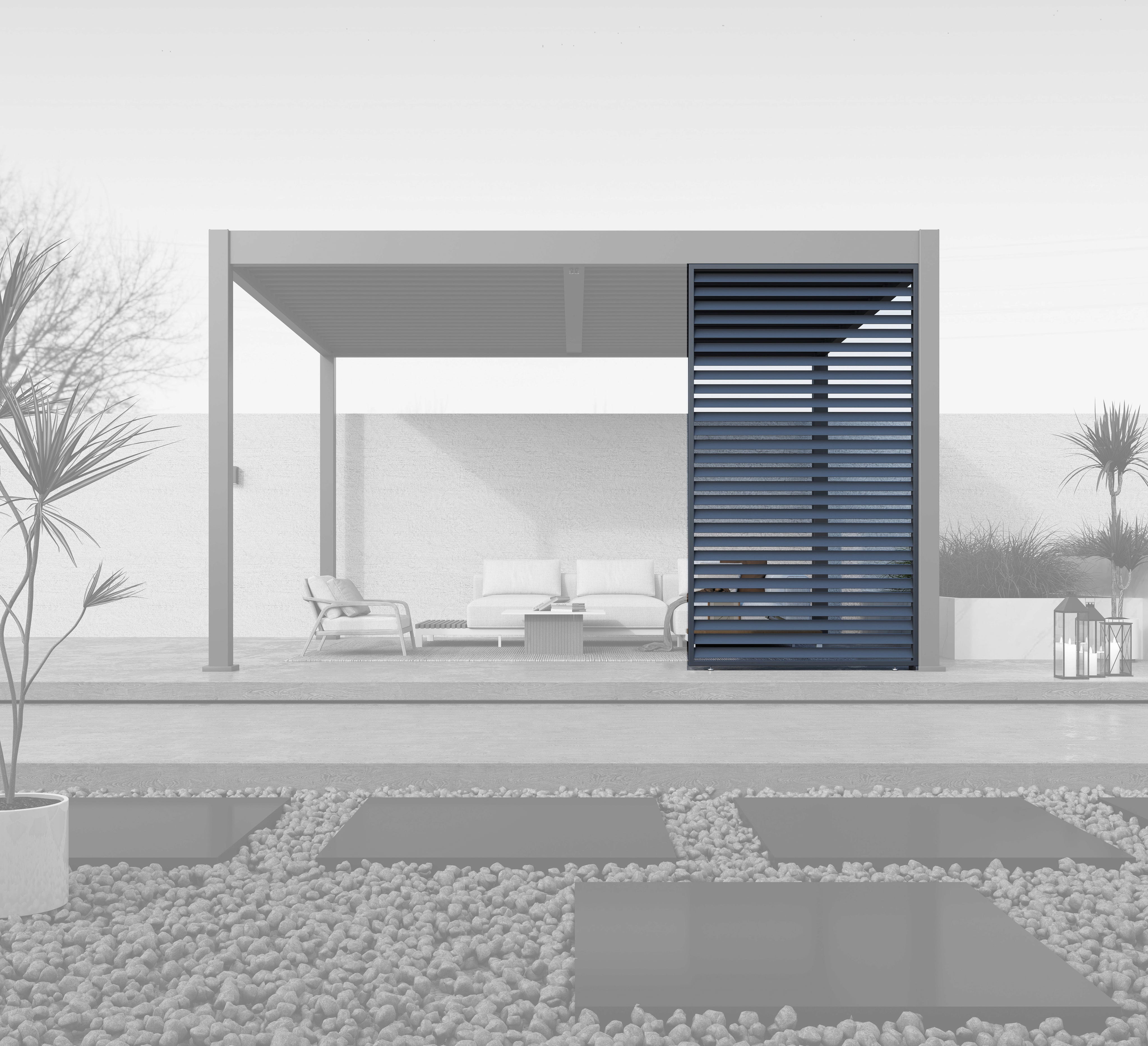 Die präzise gefertigte Wand aus pulverbeschichtetem Aluminium fügt sich nahtlos in die hochwertige Struktur deiner Pergola ein und schafft eine klare, moderne Ästhetik. Dabei gelingt der Konstruktion ein eleganter Spagat: Während die horizontal angeordneten Lamellen eine verlässliche Barriere gegen neugierige Blicke bilden, bleibt die natürliche Luftzirkulation erhalten, sodass du stets eine angenehme Brise unter deinem Terrassendach genießt.