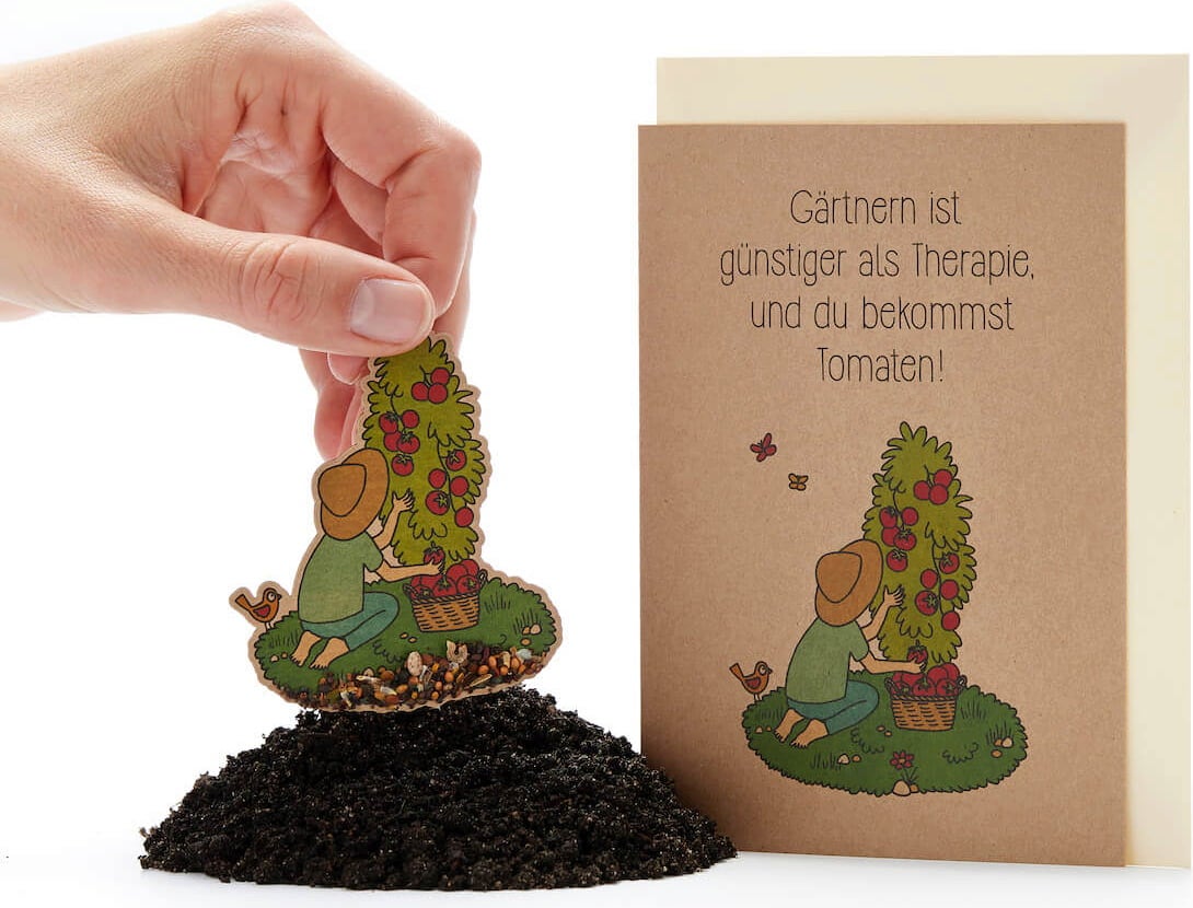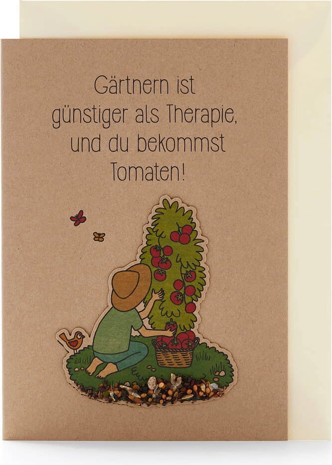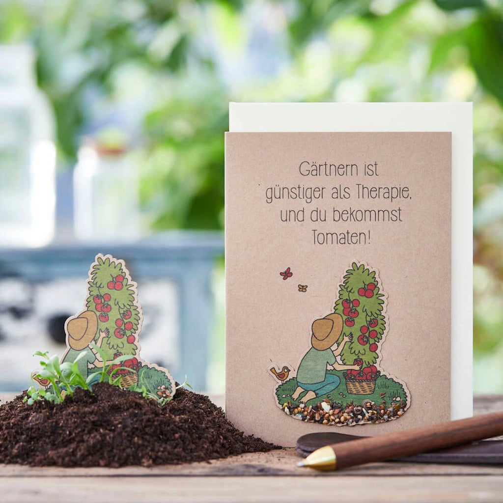 die Stadtgärtner Grußkarte mit Saatstecker "Gärtnern ist günstiger als Therapie"