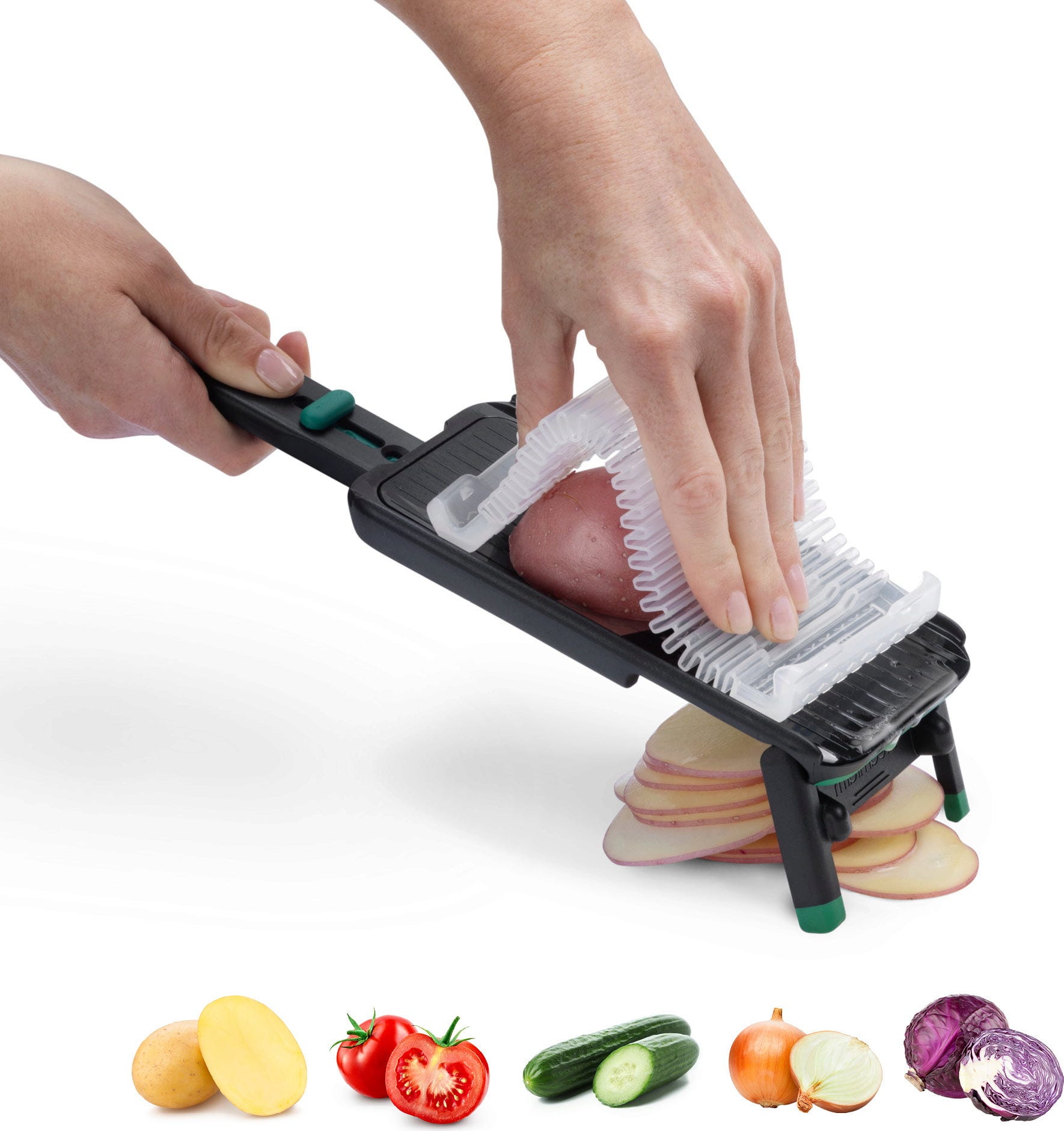 Salat, Kartoffeln, frisches Gemüse und knackiger Salat lassen sich jetzt so schnell und sicher wie nie zuvor in perfekte Scheiben schneiden! Die Nocutu Mandoline von Dreamfarm punktet mit einer rasiermesserscharfen Edelstahlklinge, die du ganz nach deinem Bedarf zwischen 1 und 3 mm Dicke einstellen kannst. Damit du dir beim Arbeiten keine Sorgen um deine Finger machen musst, gehört ein großzügiger, flexibler Fingerschutz zum Set, der dich zuverlässig vor Verletzungen bewahrt.