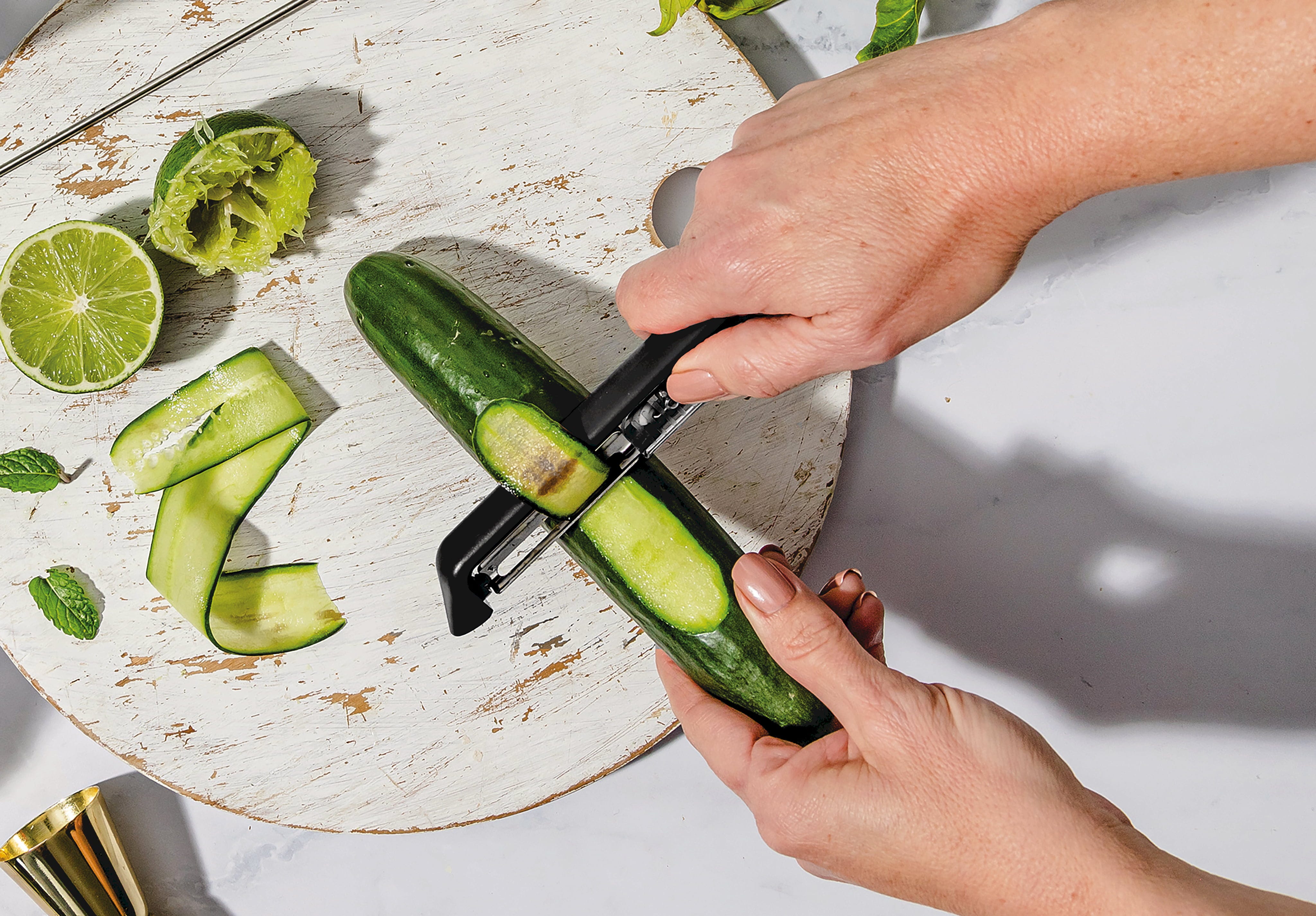 Der Sparschäler Sharple von Dreamfarm ist mit einer rasiermesserscharfen Klinge aus japanischem Edelstahl ausgestattet, die durch die schwenkbare Aufhängung besonders wenig Abfall produziert. Das absolute Highlight ist die innovative Sicherheitsabdeckung: Jedes Mal, wenn du den Schutz öffnest oder schließt, schärft ein eingebauter Keramikkugelschärfer die Klinge automatisch nach. So gleitest du bei jeder Anwendung mühelos durch Obst- und Gemüseschalen, während der integrierte Kartoffelaugen-Entferner unschöne Stellen im Handumdrehen beseitigt. Ob Rechts- oder Linkshänder, dieser ergonomische Helfer liegt perfekt in der Hand und wandert nach der Arbeit zur praktischen Reinigung einfach in die Spülmaschine.