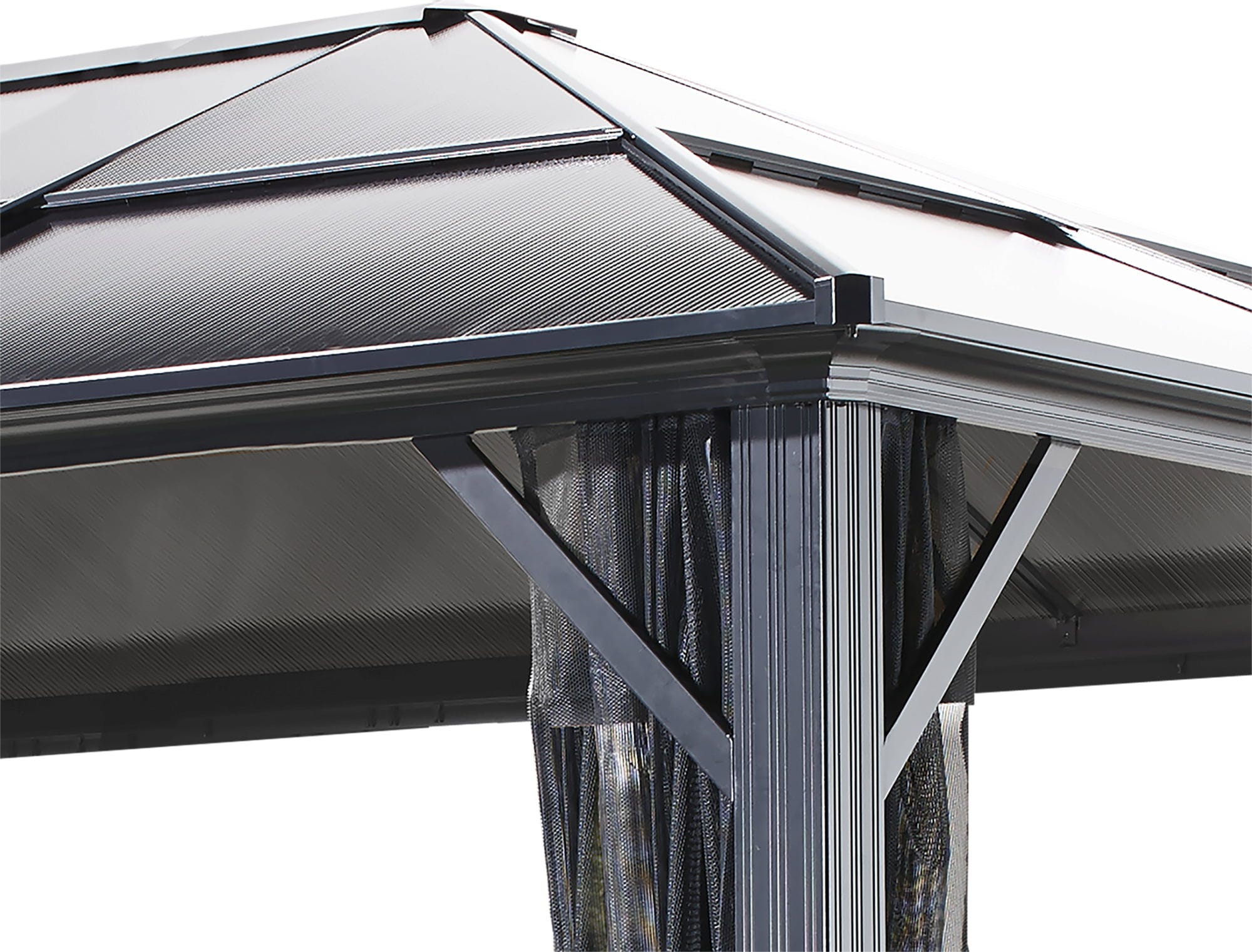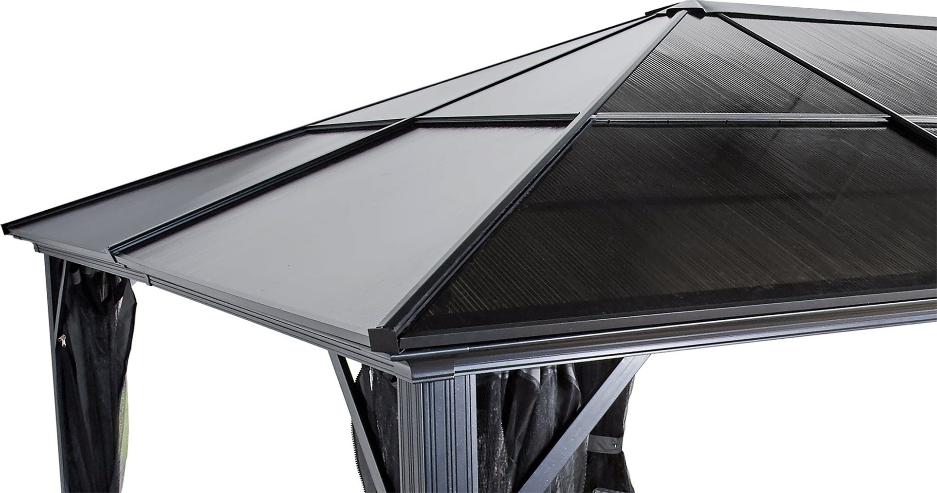 Die robuste, pulverbeschichtete Aluminiumkonstruktion bildet das langlebige Grundgerüst für die 8 mm starken Doppelstegplatten aus Polycarbonat. Diese spezielle Dacheindeckung schützt dich zuverlässig vor Witterungseinflüssen und bietet dank einseitigem UV-Schutz optimalen Komfort bei sonnigem Wetter. So wird jede Mahlzeit im Freien und jeder entspannte Nachmittag mit einem Buch zu einem wetterunabhängigen Erlebnis.