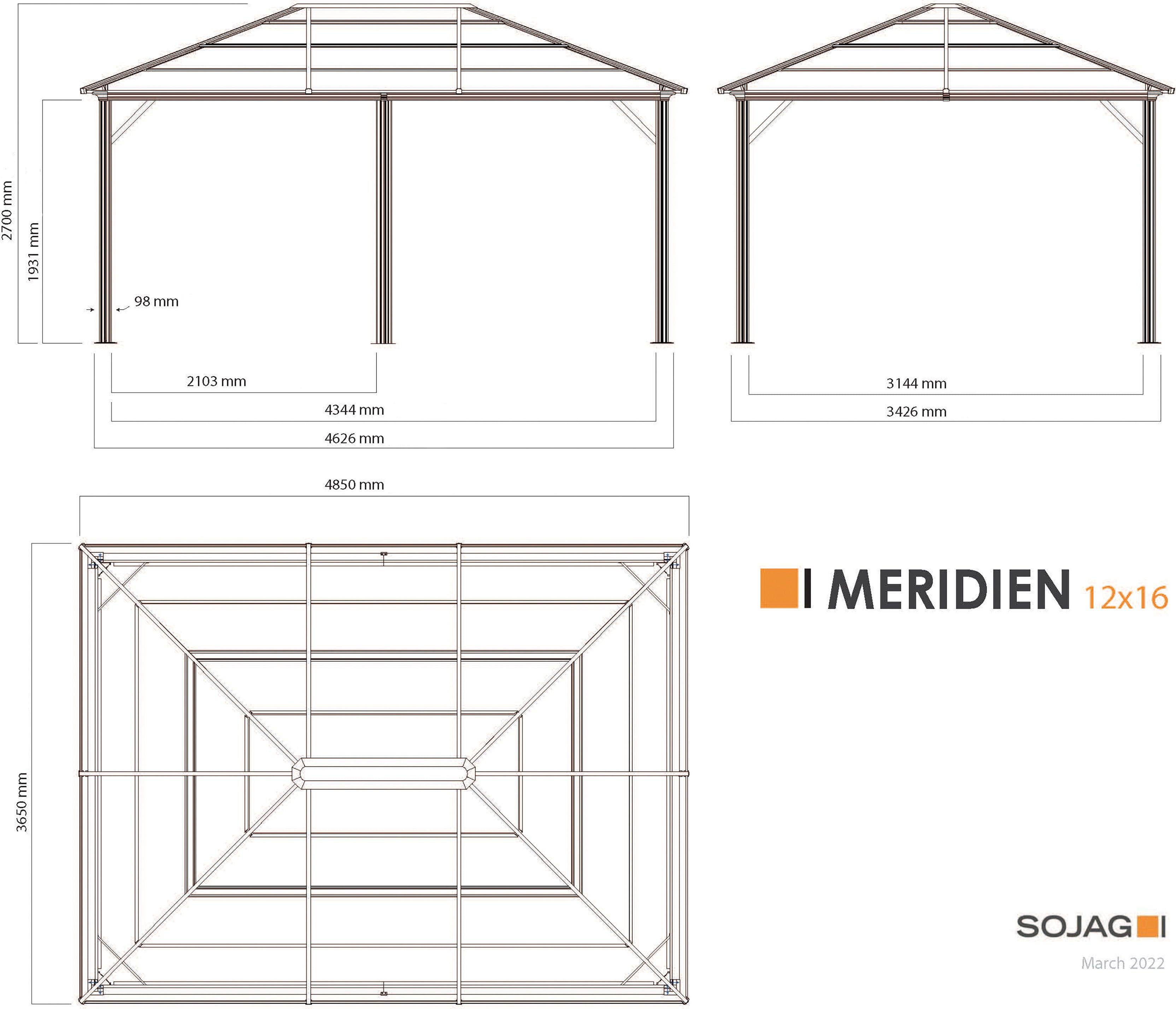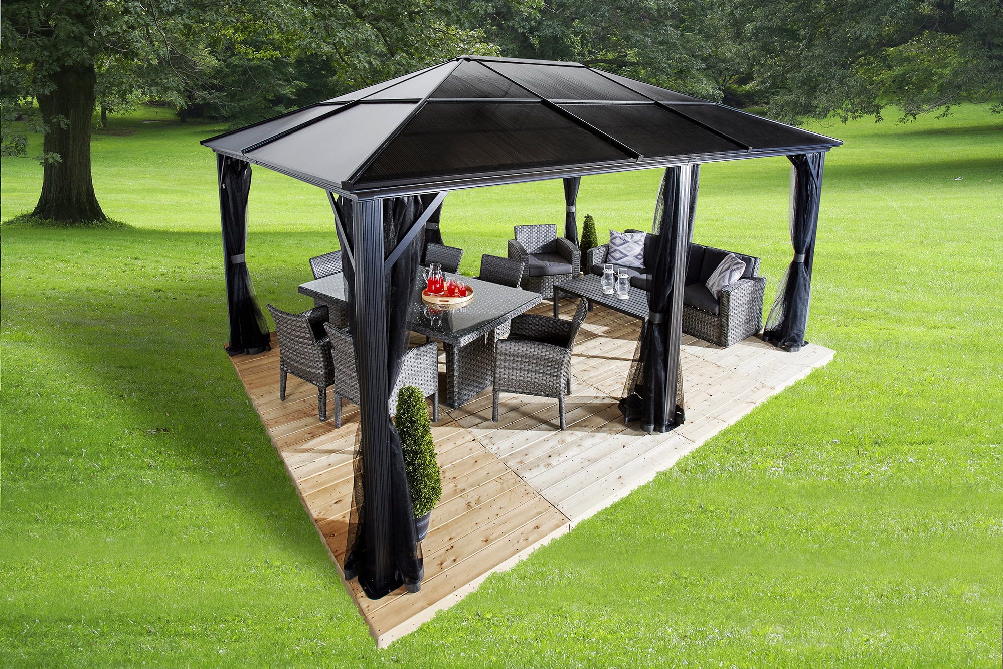 Erweitere deinen Wohnraum nach draußen mit dem Pavillon Meridien von Sojag, der zeitlose Eleganz mit hoher Funktionalität vereint.