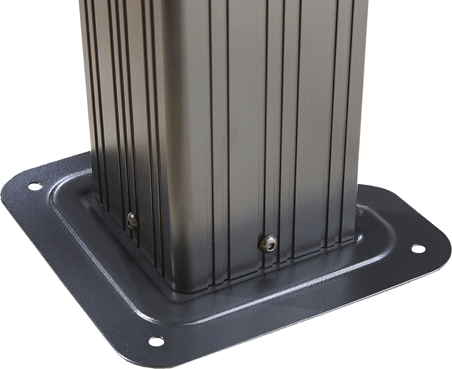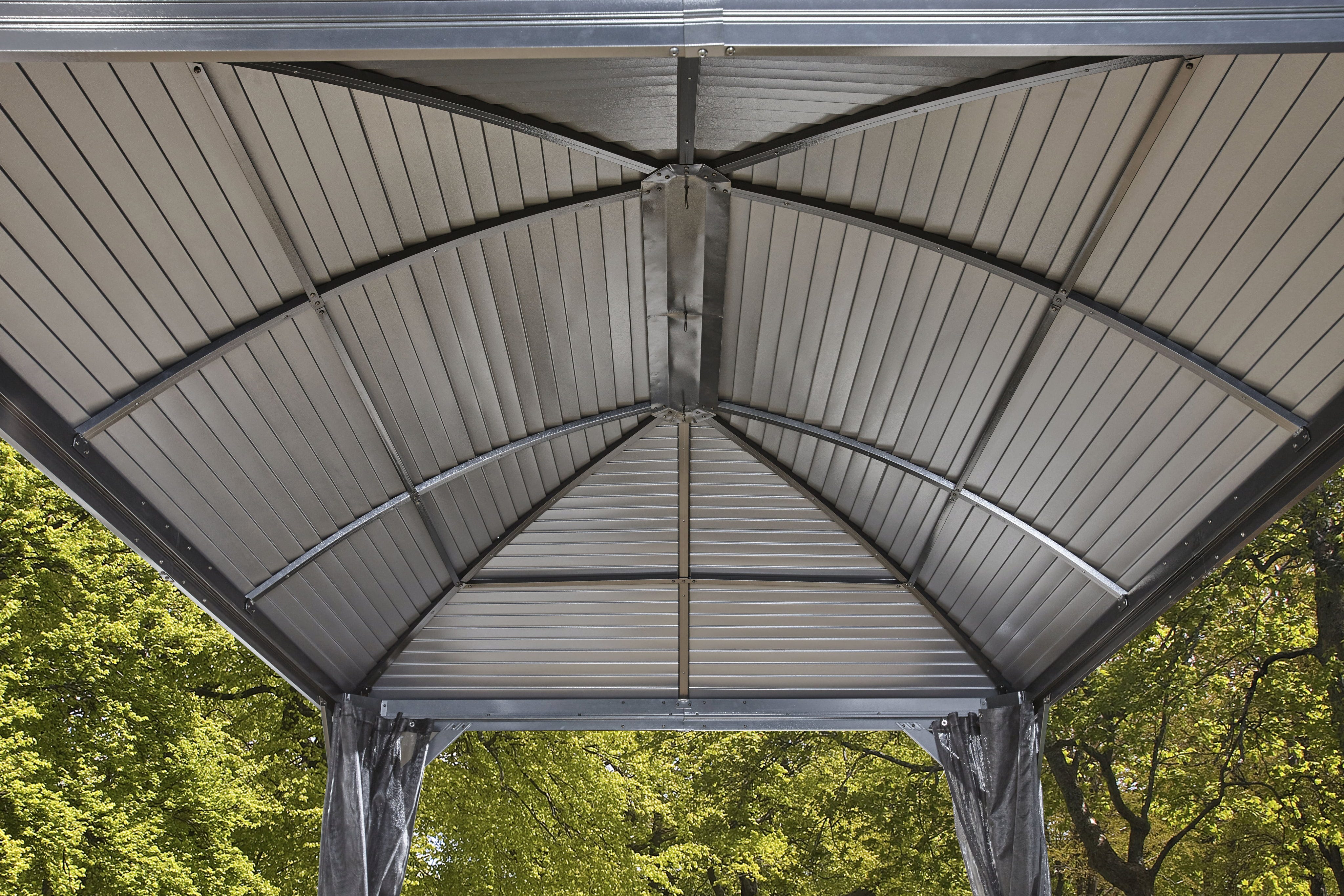 Die massive Konstruktion aus pulverbeschichtetem Aluminium mit 12 cm starken Pfosten und langlebigen Edelstahlschrauben sorgt für höchste Stabilität bei jeder Witterung. Das Dach aus galvanisiertem Stahlblech bietet dir dabei nicht nur optimalen Sonnenschutz, sondern schirmt dich auch bei Regen zuverlässig ab.