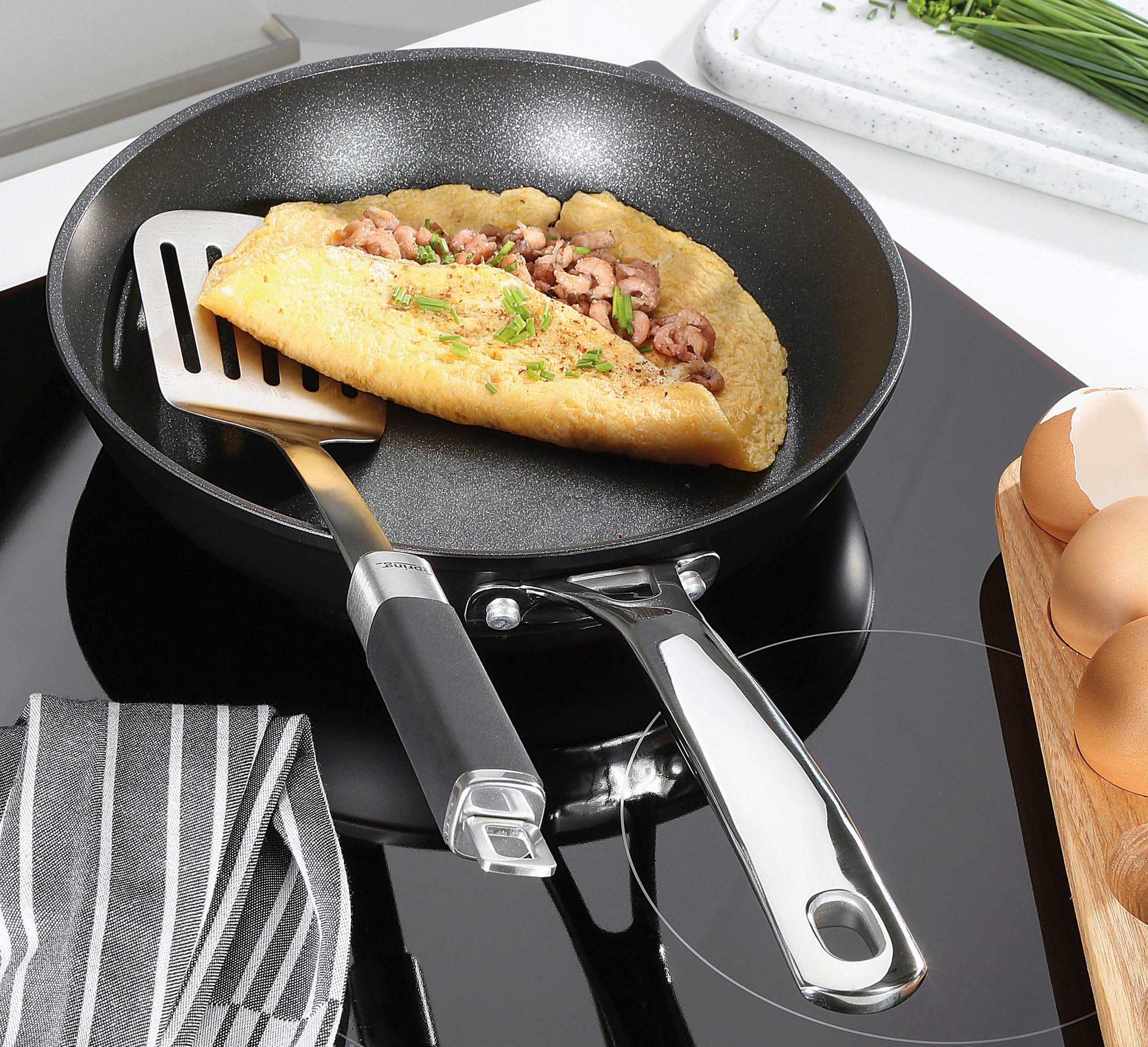 Mit der Meridian Intense Pro von Spring holst du dir echtes Profi-Equipment direkt in deine Küche! Das Herzstück bildet der massive Pfannenkörper, der Hitze extrem schnell und gleichmäßig bis zum Rand verteilt. Ob du scharf anbraten oder sanft schmoren möchtest – die innovative 3-fach Versiegelung mit echten Schweizer Bergkristallen ist so hart, dass du sogar bedenkenlos mit dem Metallwender darin arbeiten kannst.