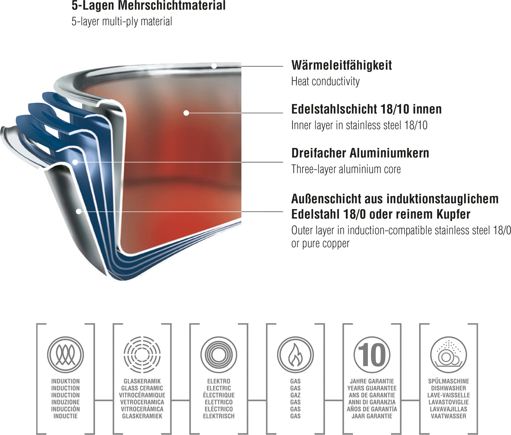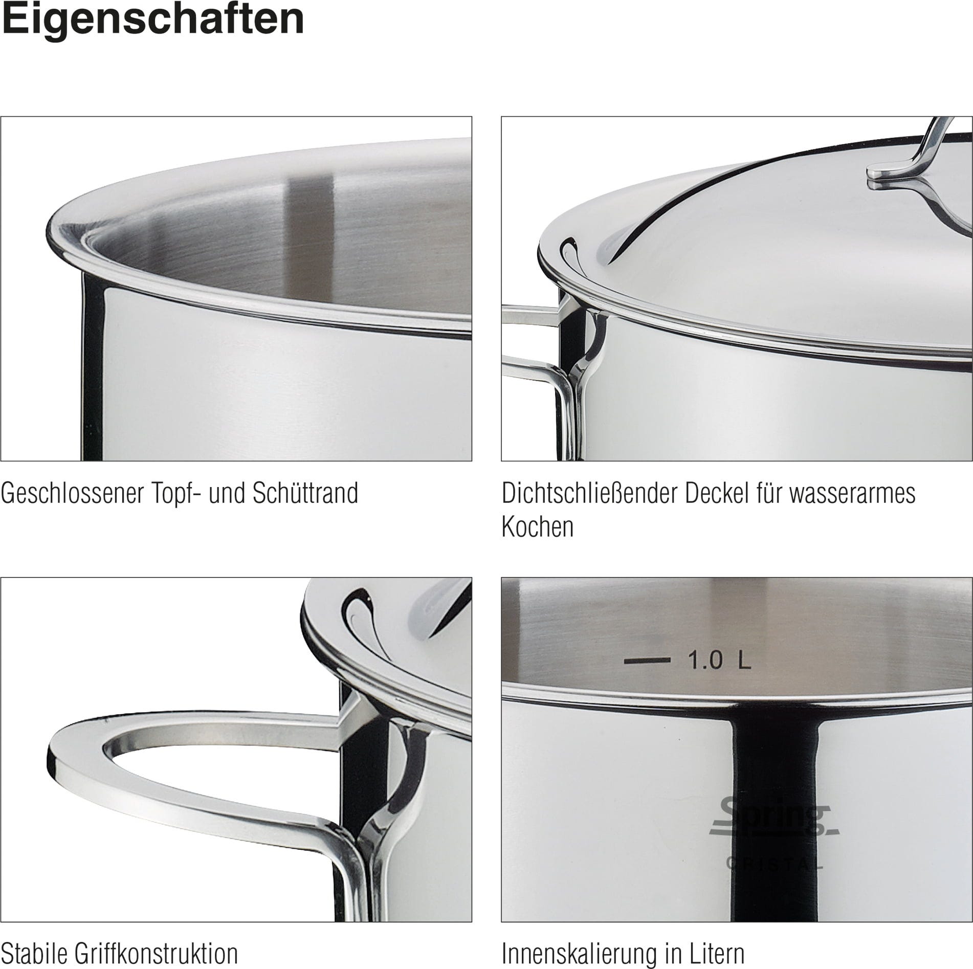 Seit über 25 Jahren gehört die Cristal-Serie von Spring zur Grundausstattung jeder anspruchsvollen Küche! Das Geheimnis dieses Klassikers liegt im 5-Lagen-Mehrschichtmaterial, das die Hitze nicht nur am Boden hält, sondern direkt in die Topfwände leitet. So wird dein Kochgut von allen Seiten gleichmäßig, vitaminschonend und extrem energiesparend erhitzt.