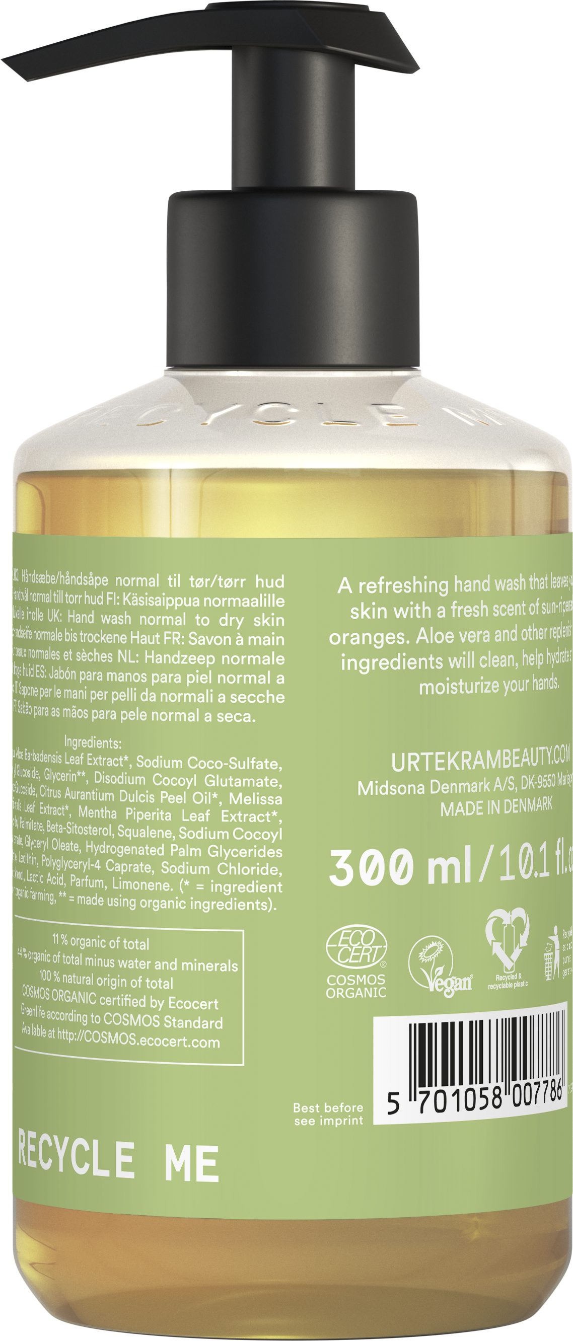 Der erfrischende Duft von sonnengereiften Orangen macht das Händewaschen zur Freude. Gleichzeitig sorgt der äußerst hohe Anteil an Aloe Vera für einen herrlichen Schaum und versorgt die Hände angenehm mit Feuchtigkeit.