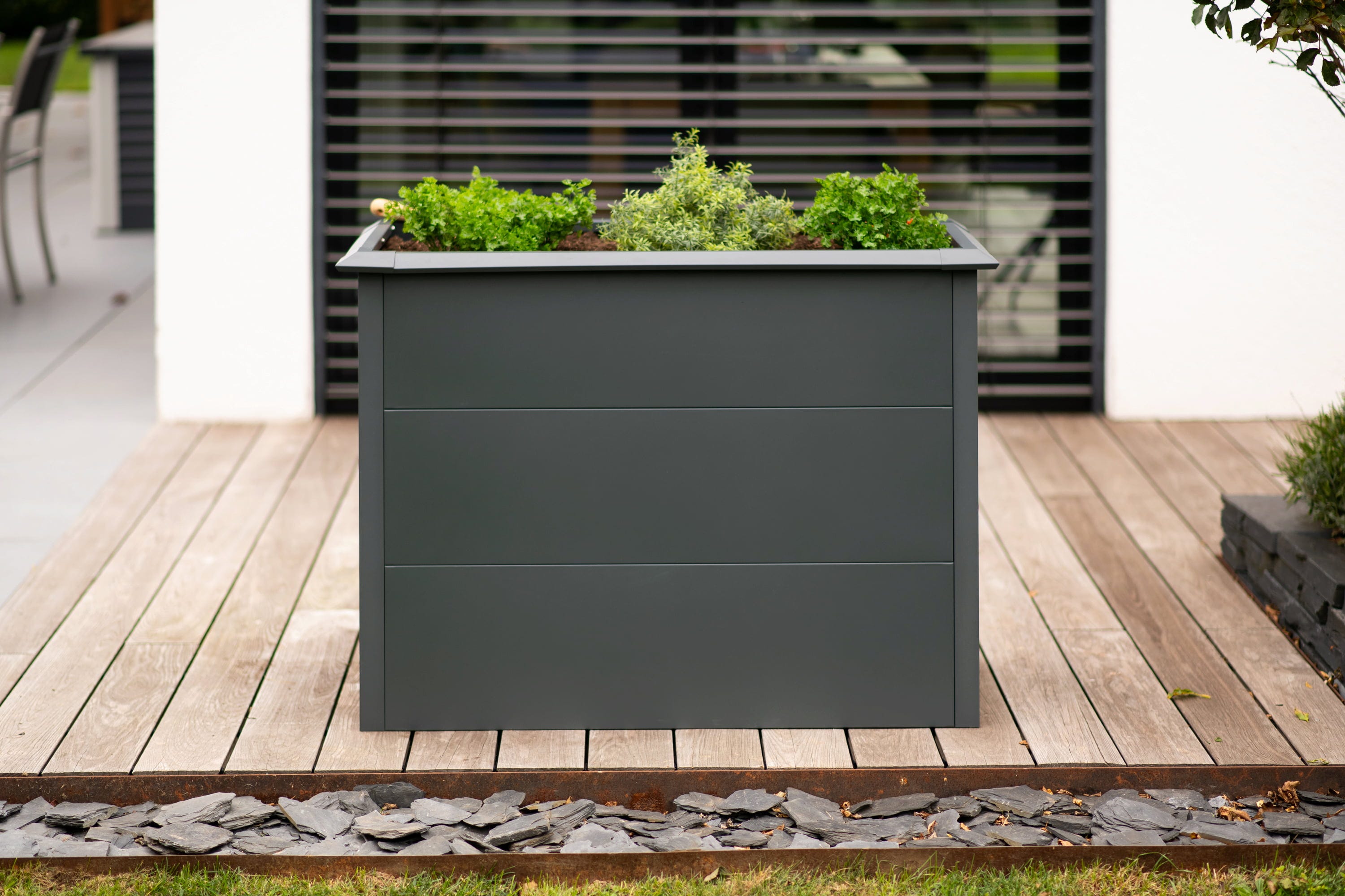 Die erhöhte Position der Kulturfläche sorgt dafür, dass du deine Kräuter und Gemüsepflanzen ganz bequem erreichen kannst, während das Hochbeet gleichzeitig als stilvoller Strukturgeber auf deinem Grundstück dient.