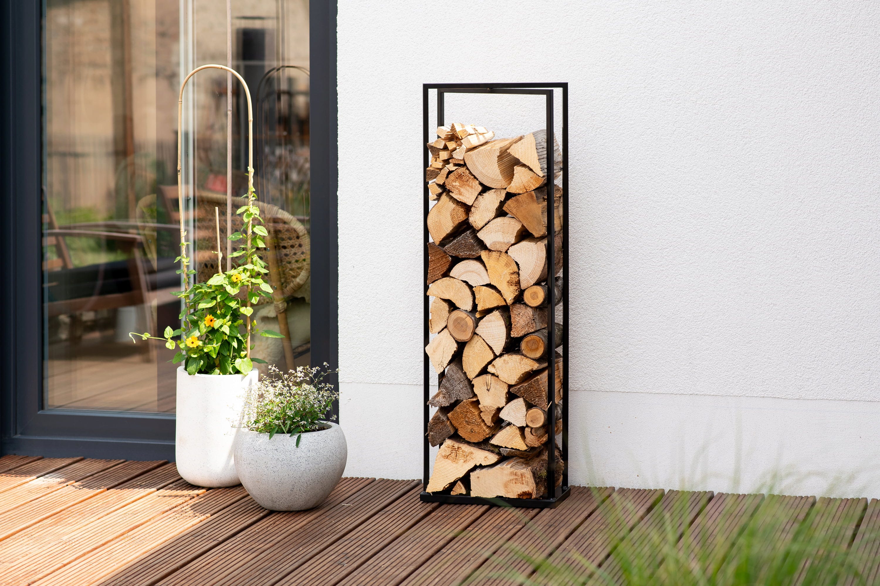 Gefertigt aus hochwertigem, pulverbeschichtetem Stahl, vereint dieses Regal eine filigrane Optik mit der nötigen Robustheit, um deine Holzscheite sicher und griffbereit zu lagern. Dank der schlanken Maße fügt es sich selbst in Nischen oder neben schmalen Kaminöfen perfekt ein, ohne den Raum zu überladen.