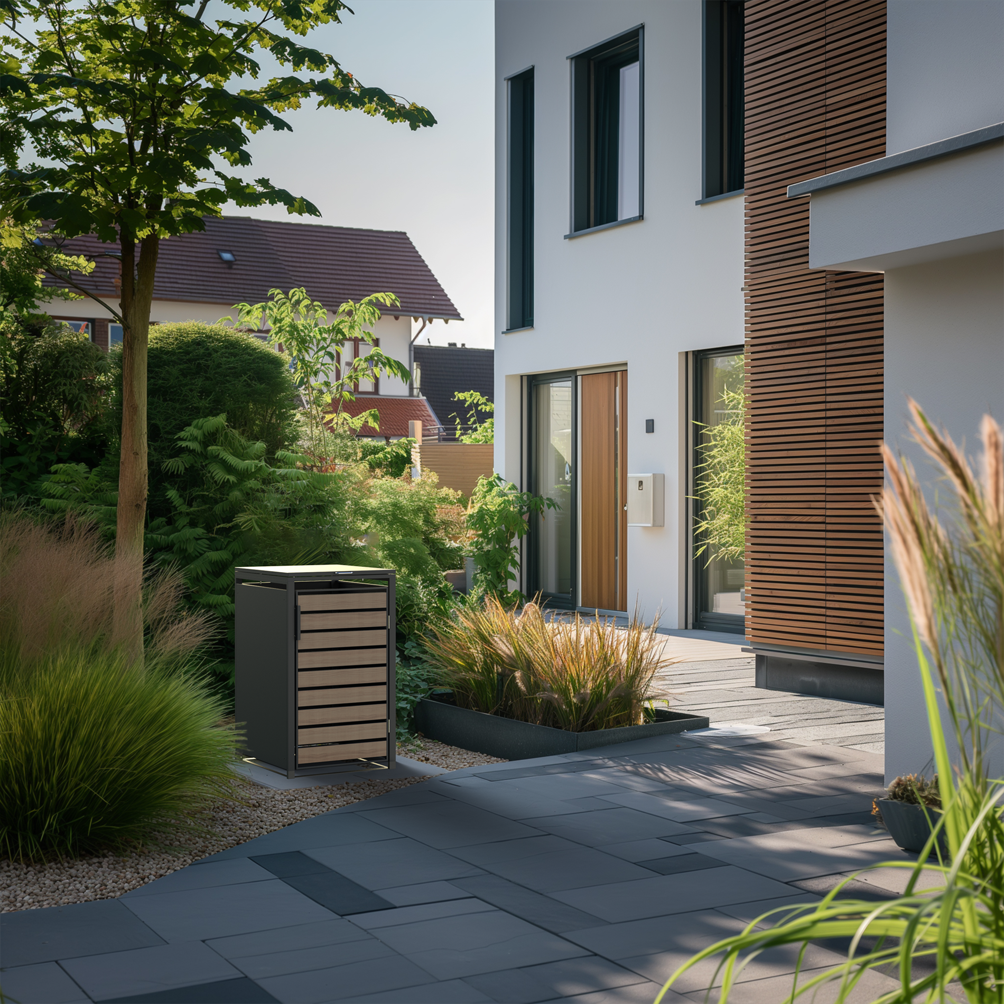 Mit der Westmann Mülltonnenbox Lacina kannst du deine Mülltonnen ganz diskret verbergen. Das elegante Design in moderner Holzoptik lässt unschöne Kunststofftonnen hinter einer hochwertigen Fassade aus pulverbeschichtetem Stahl verschwinden. Dabei profitierst du nicht nur von der ästhetischen Aufwertung: Die Box schirmt deine Tonnen effektiv vor direkter Sonneneinstrahlung ab, was die Geruchsentwicklung an warmen Tagen reduzieren kann. Ob du eine einzelne Tonne kaschieren möchtest oder Platz für ein ganzes Trennsystem bis zu fünf Tonnen benötigst – Lacina bietet dir die nötige Flexibilität und Ordnung auf deinem Grundstück.