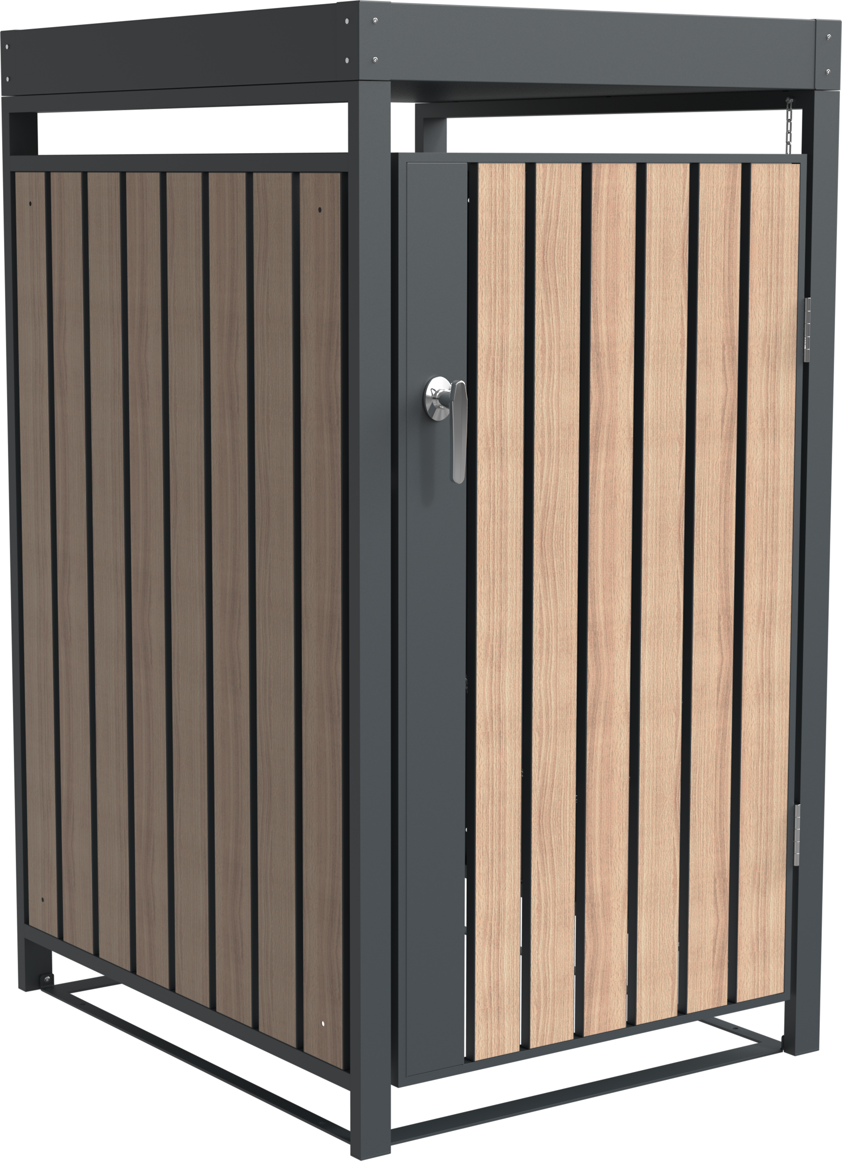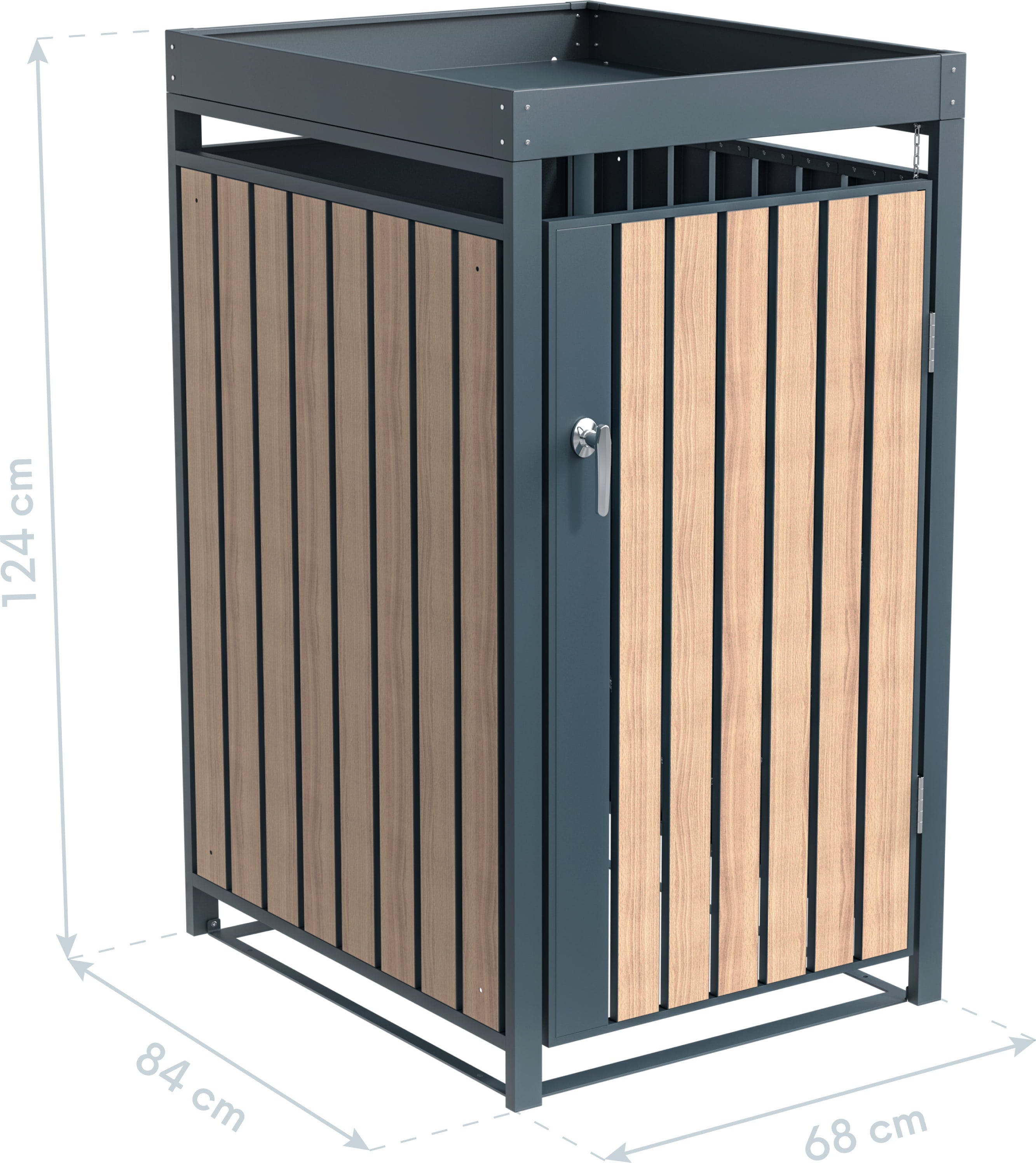 Das Handling im Alltag ist denkbar einfach: Über die großzügigen Fronttüren in edler Holzoptik lassen sich die Tonnen mühelos hinein- und herausmanövrieren. Zudem sorgt das integrierte Schloss dafür, dass unbefugter Zugriff verhindert wird. Dank der hochwertigen Materialkombination aus anthrazitfarbenem Stahl und warmen Holztönen setzt du einen exklusiven Akzent, der Langlebigkeit und modernes Design perfekt vereint!