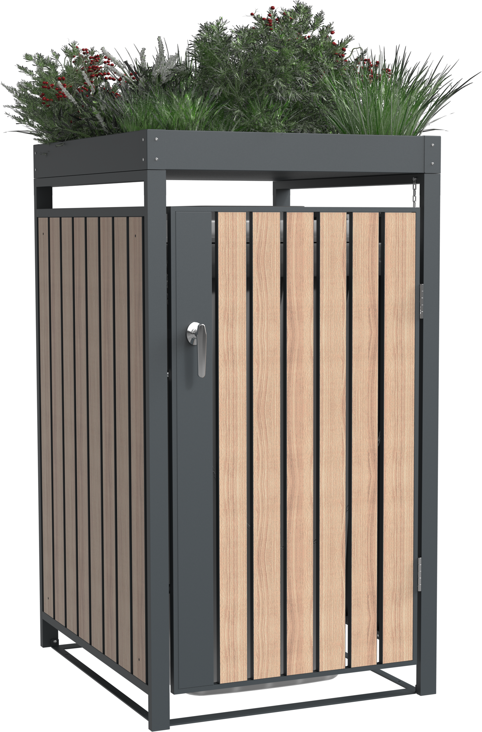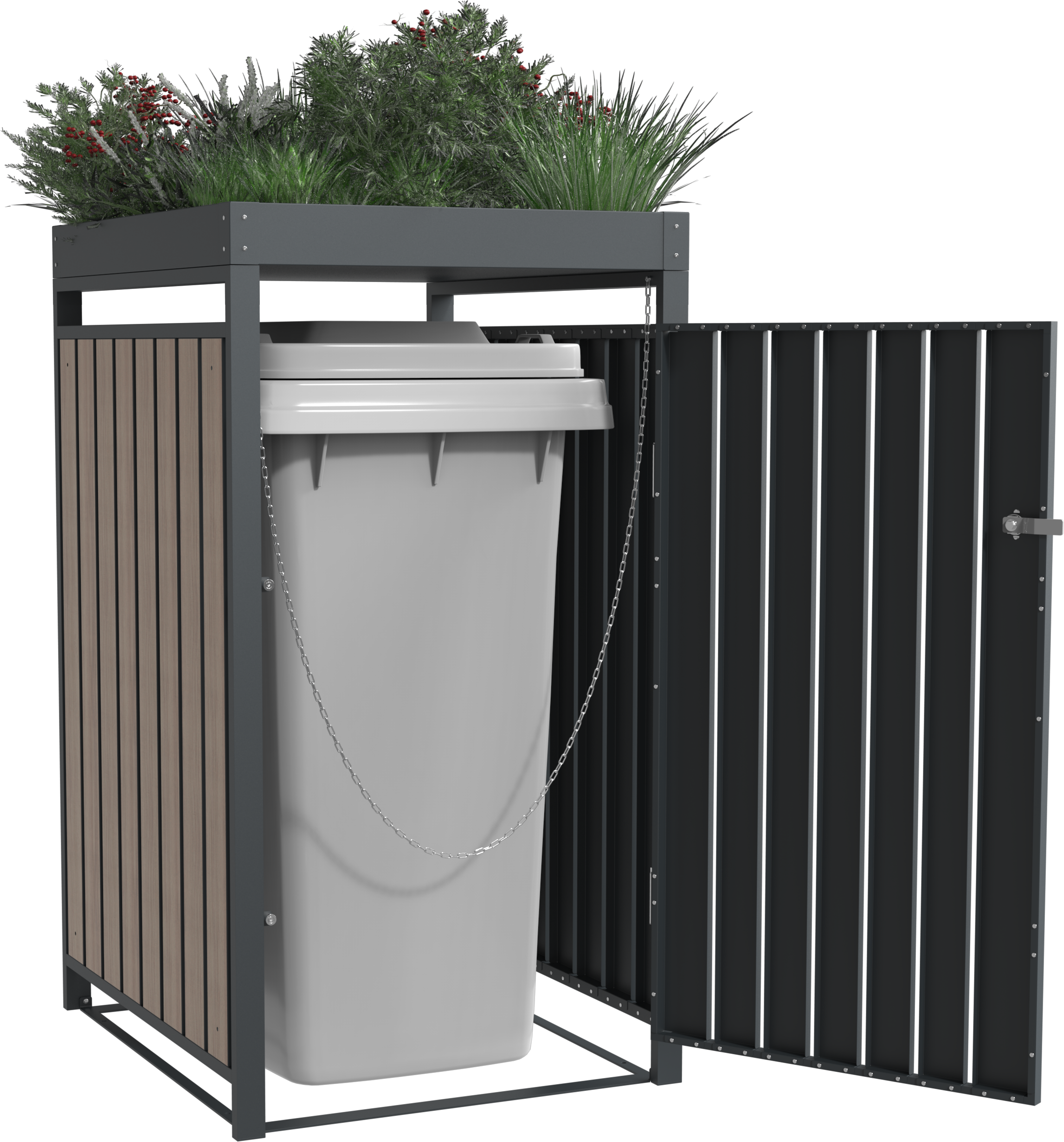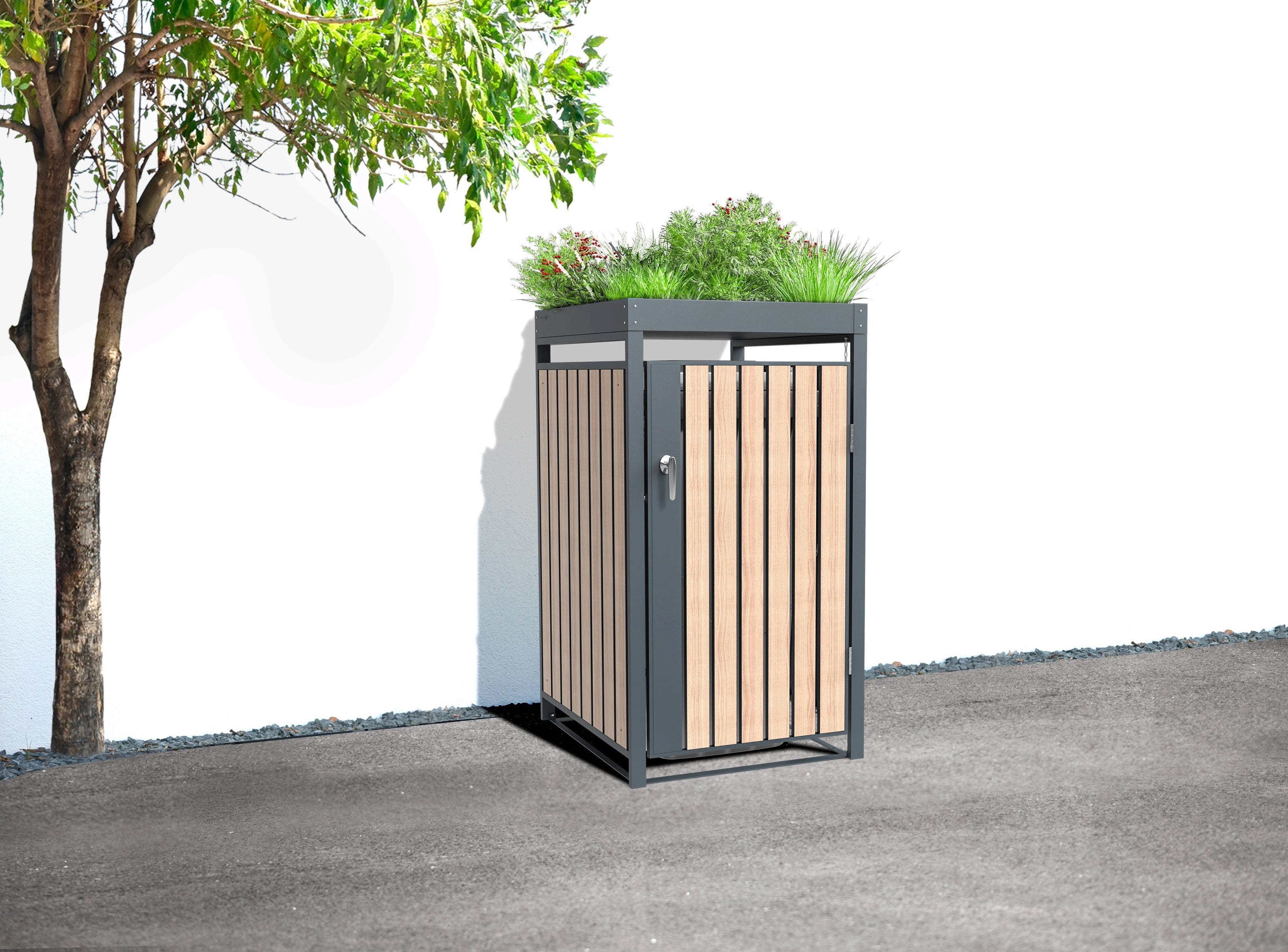 Hinter einem modernen Korpus aus hochwertigem, pulverbeschichtetem Stahl verschwinden deine Tonnen diskret und stilvoll. Das Besondere an diesem Modell ist das innovative Pflanzdach. Du hast die Freiheit, die beiden integrierten Kästen ganz nach deinem Geschmack zu begrünen – ob mit duftenden Kräutern, hängenden Sukkulenten oder saisonalen Blumen. So fügt sich die Box organisch in deine Gartenlandschaft oder deinen Einfahrtsbereich ein.