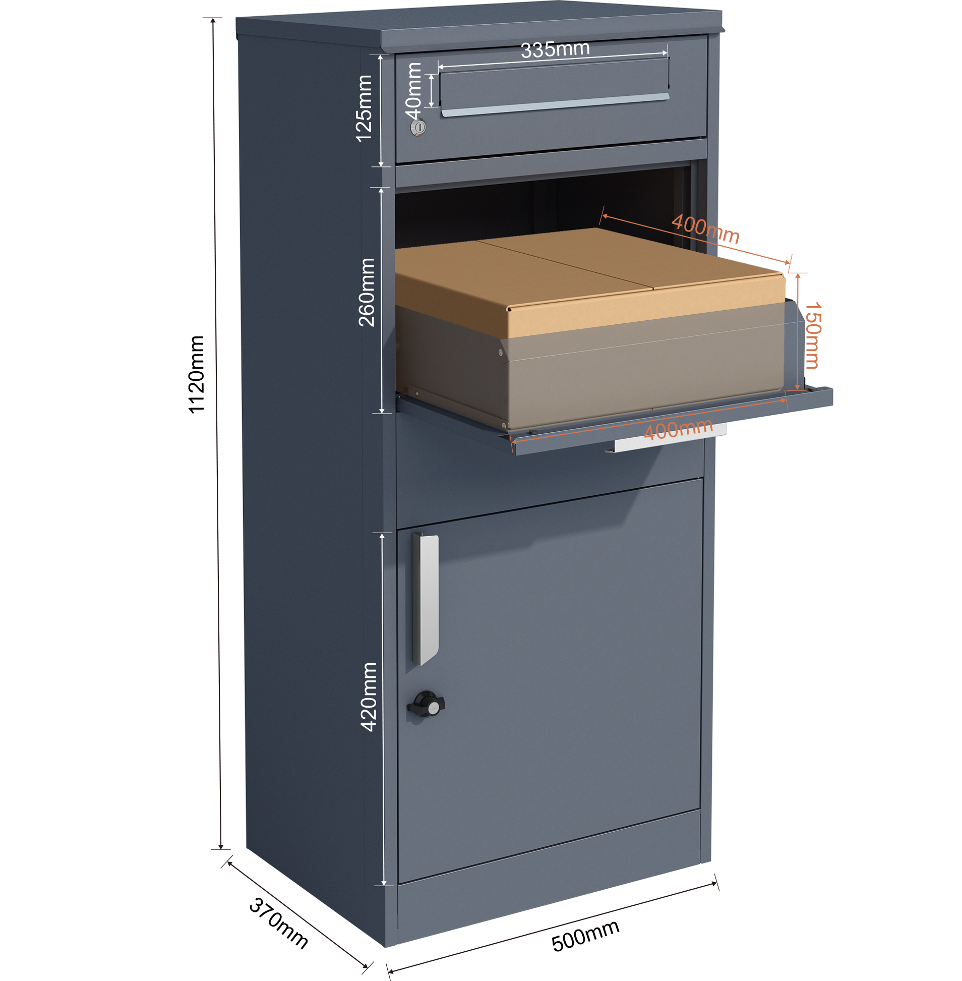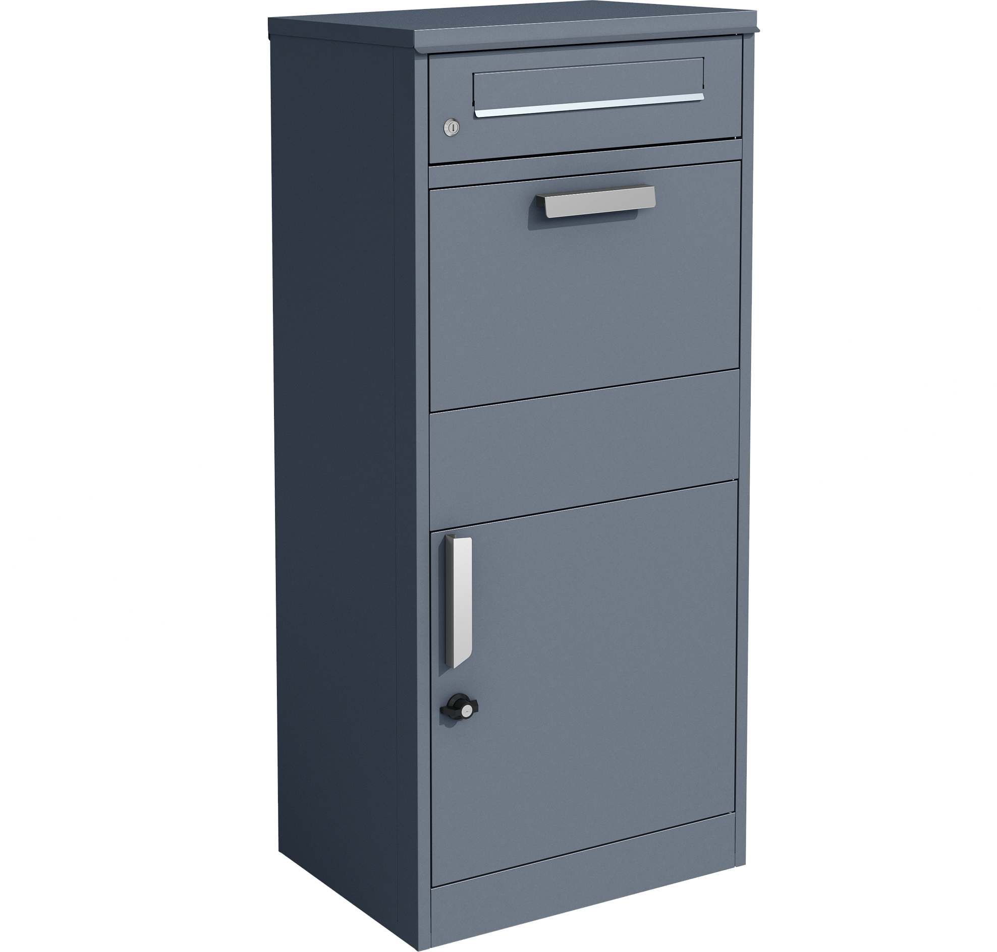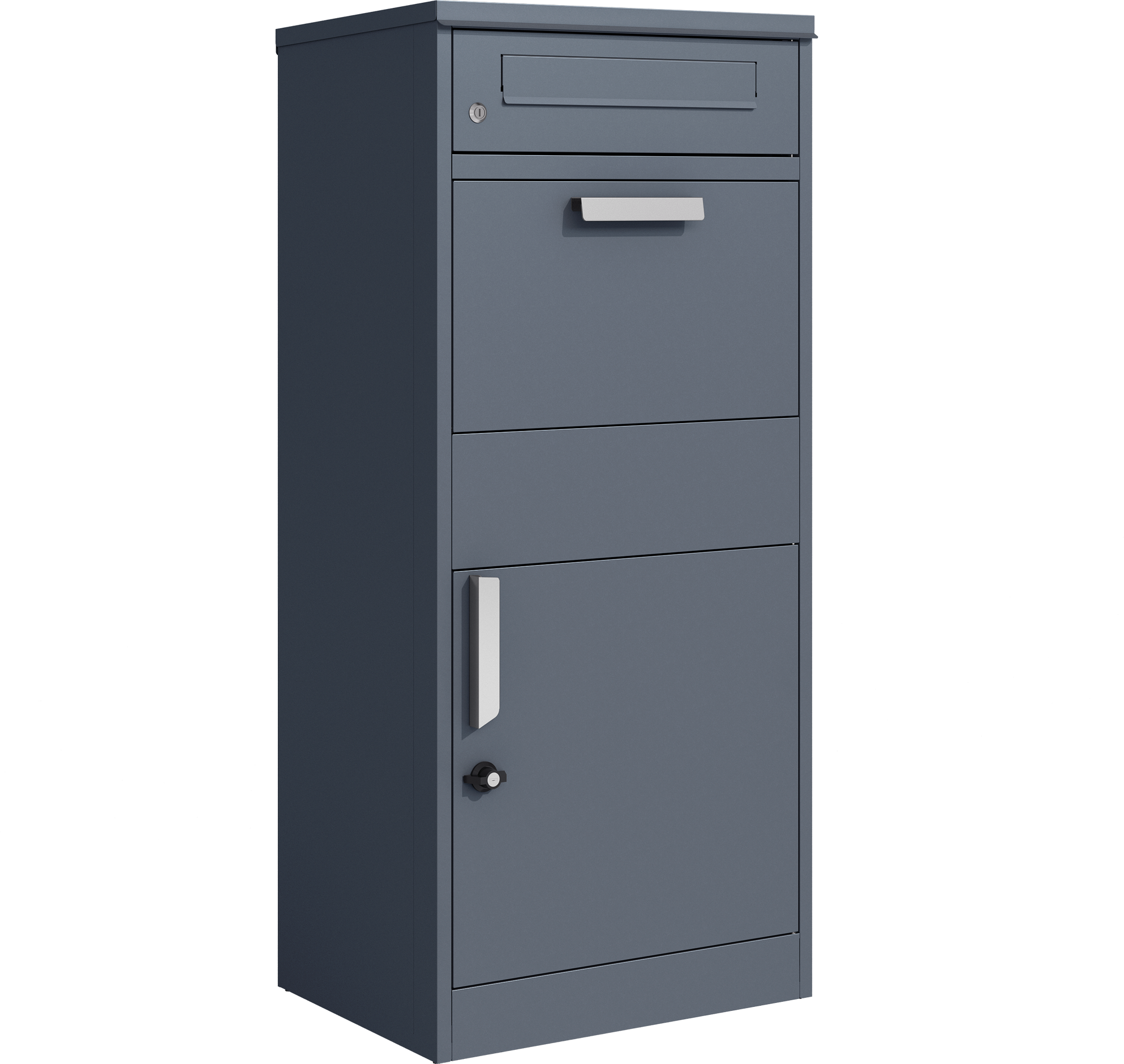 - Zweigeteiltes System: Briefschlitz oben, Paketfach unten