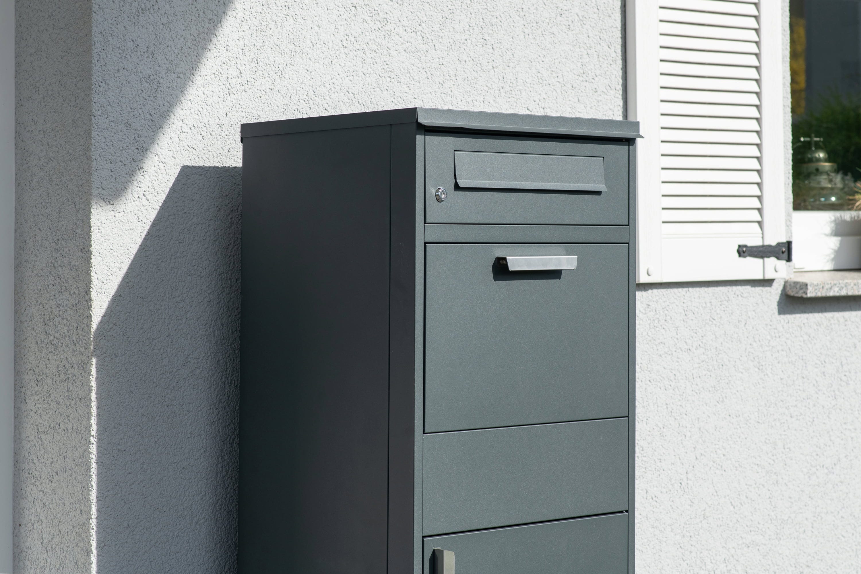 Die Box ist ein echtes Multitalent und kombiniert einen klassischen, abschließbaren Briefkasten für deine Tagespost mit einem großzügigen Kippfach für Päckchen. Das Paket wird in das obere Fach gelegt und die Klappe geschlossen – daraufhin gleitet die Sendung sicher in das untere, abgeschlossene Fach, wo sie vor unbefugtem Zugriff und jeder Wetterlage geschützt auf dich wartet.